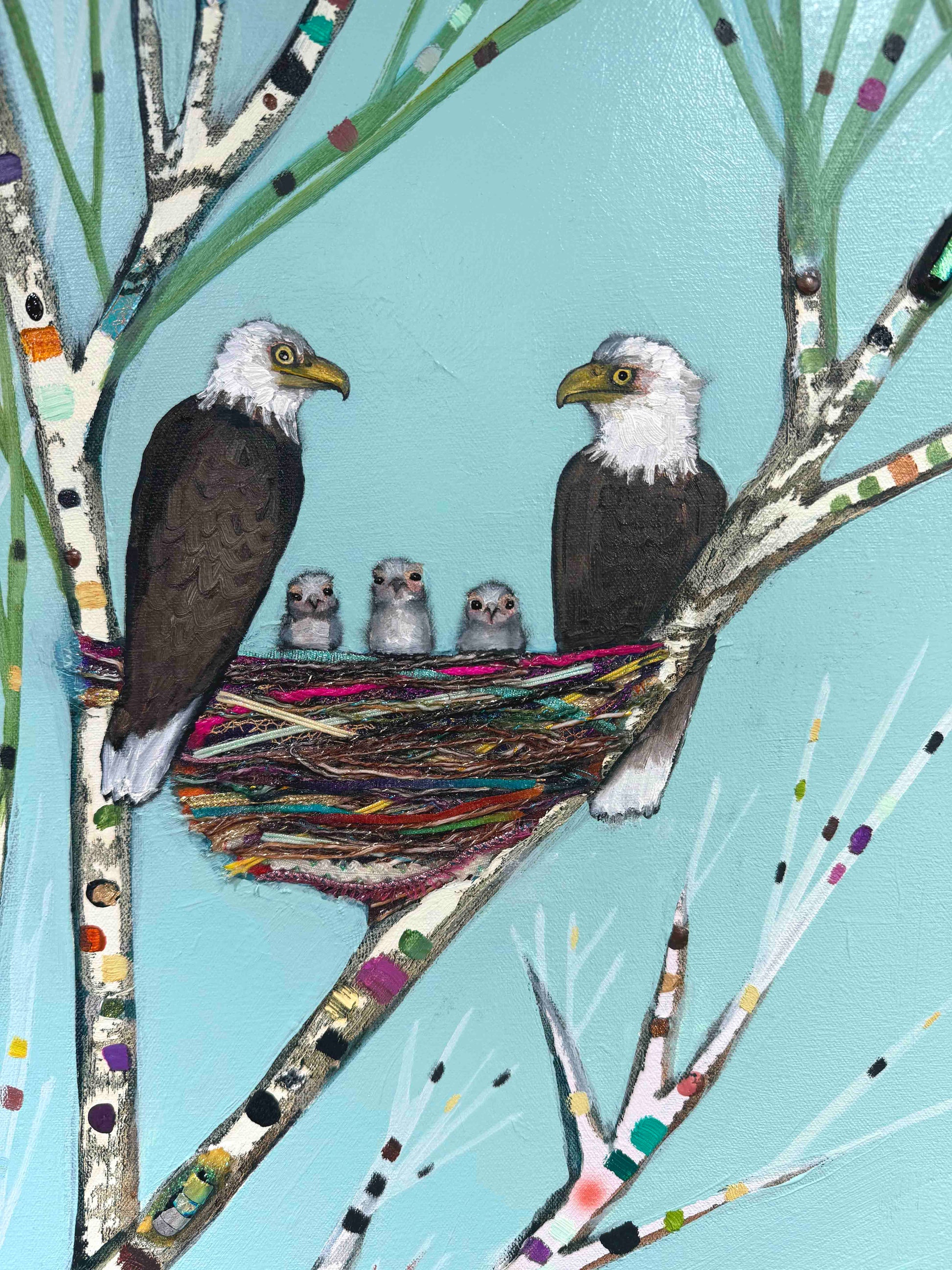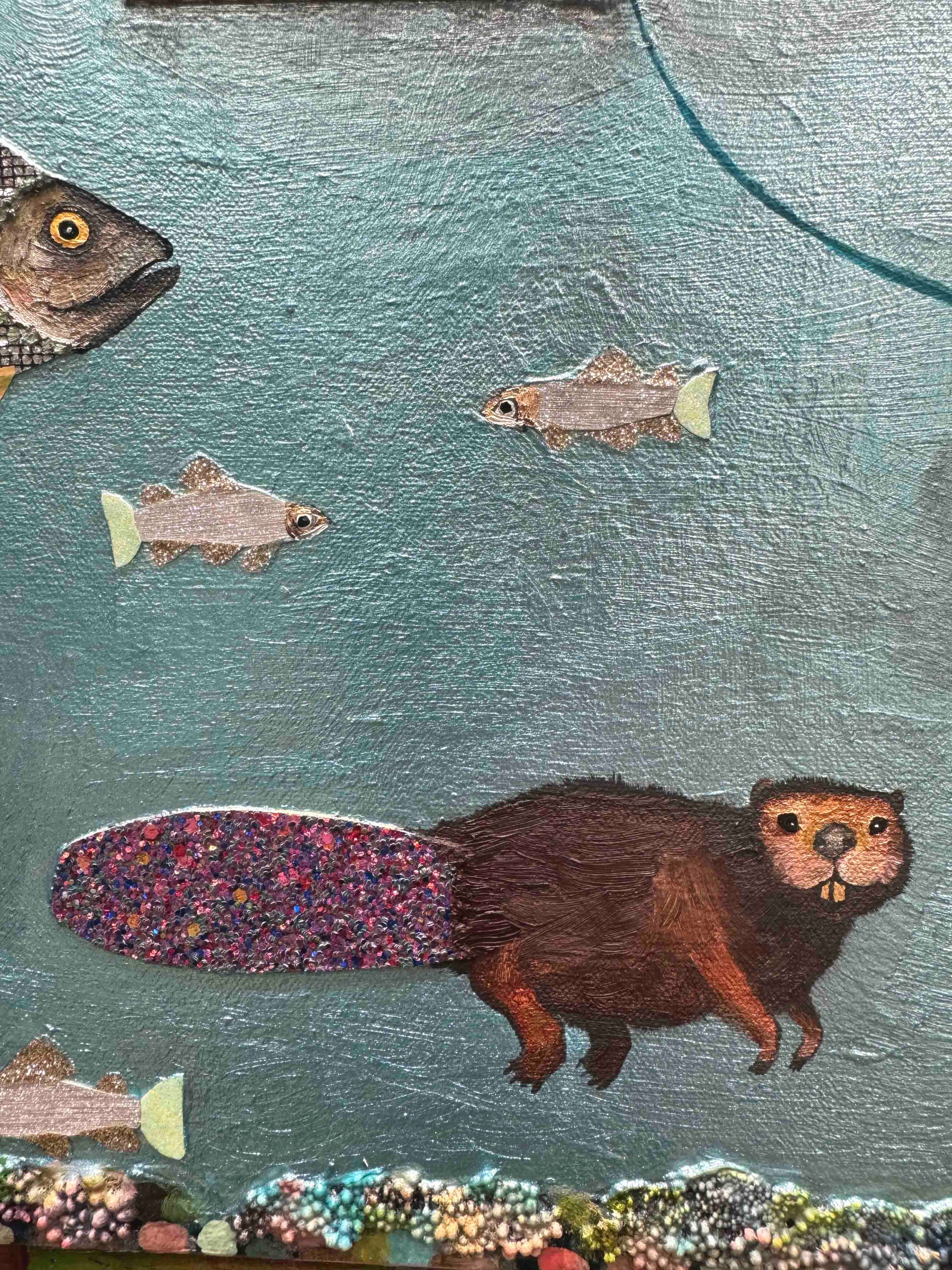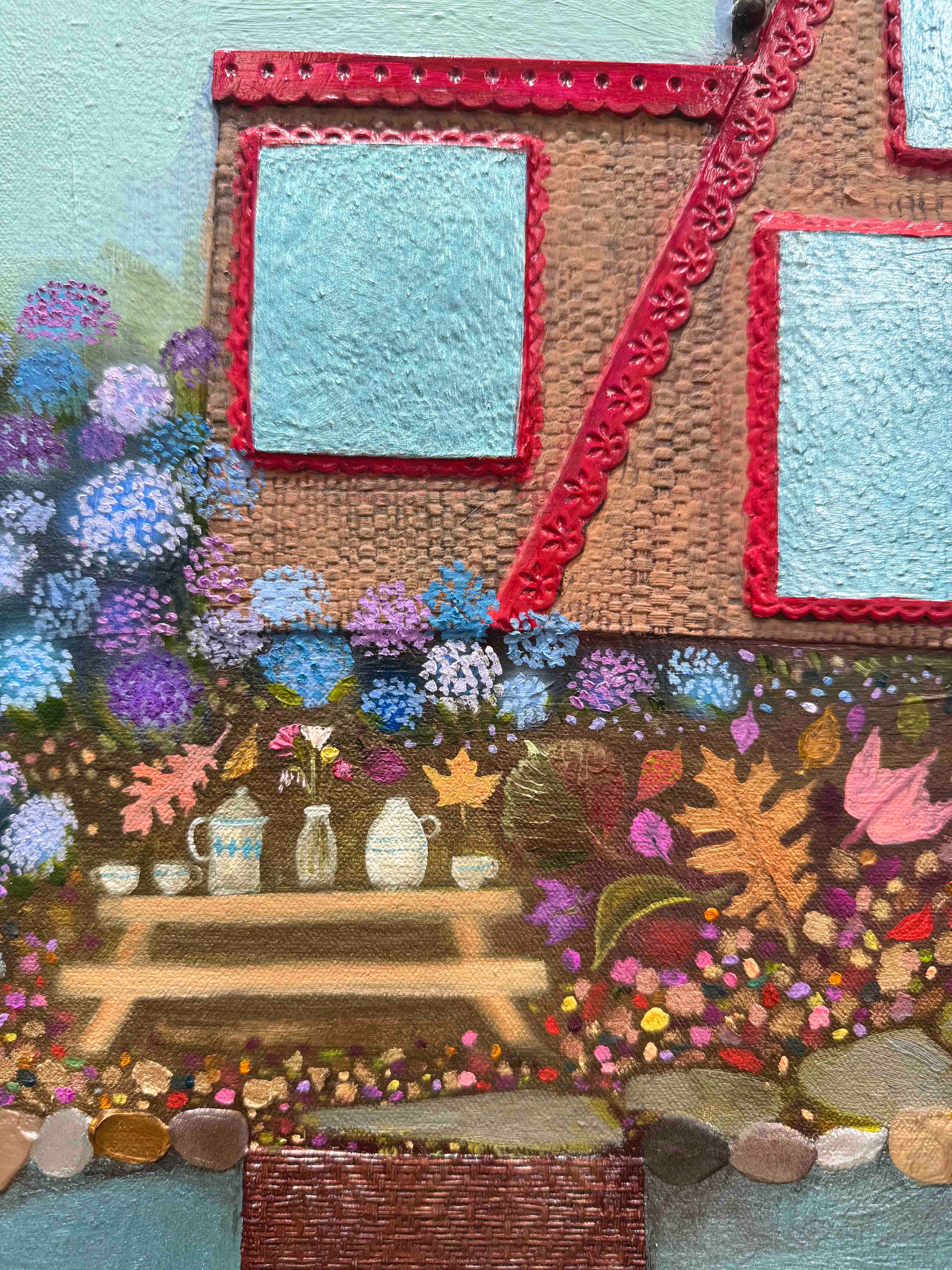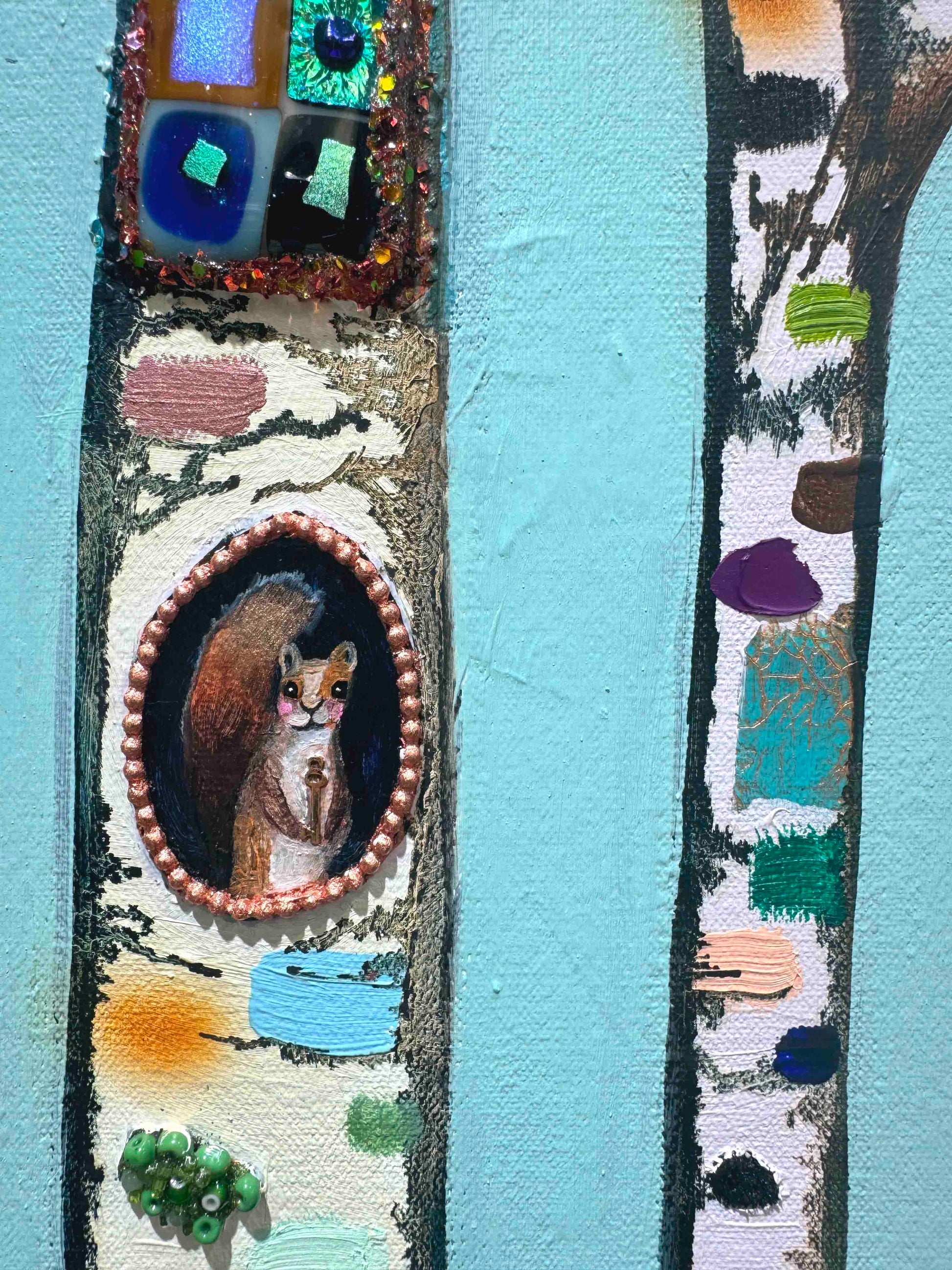 Oil, acrylic, yarn, fabric, paper, glass, gold leaf and found objects on a handmade canvas.
