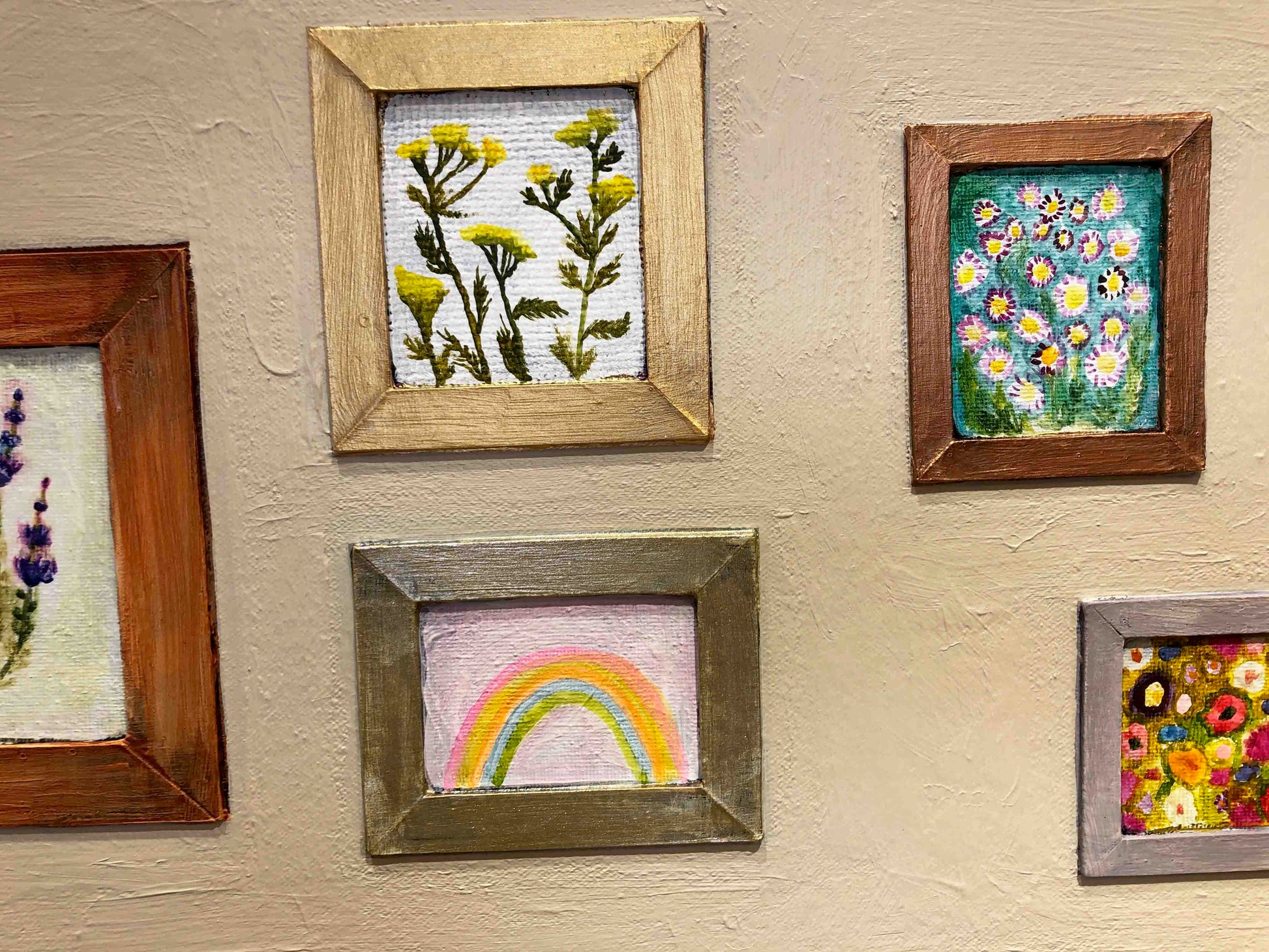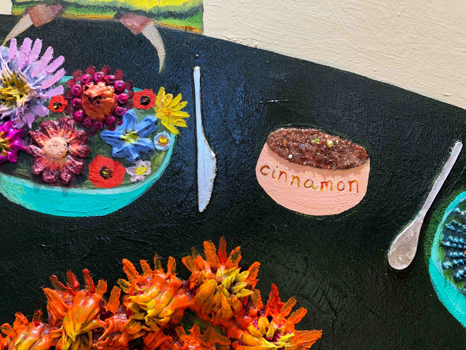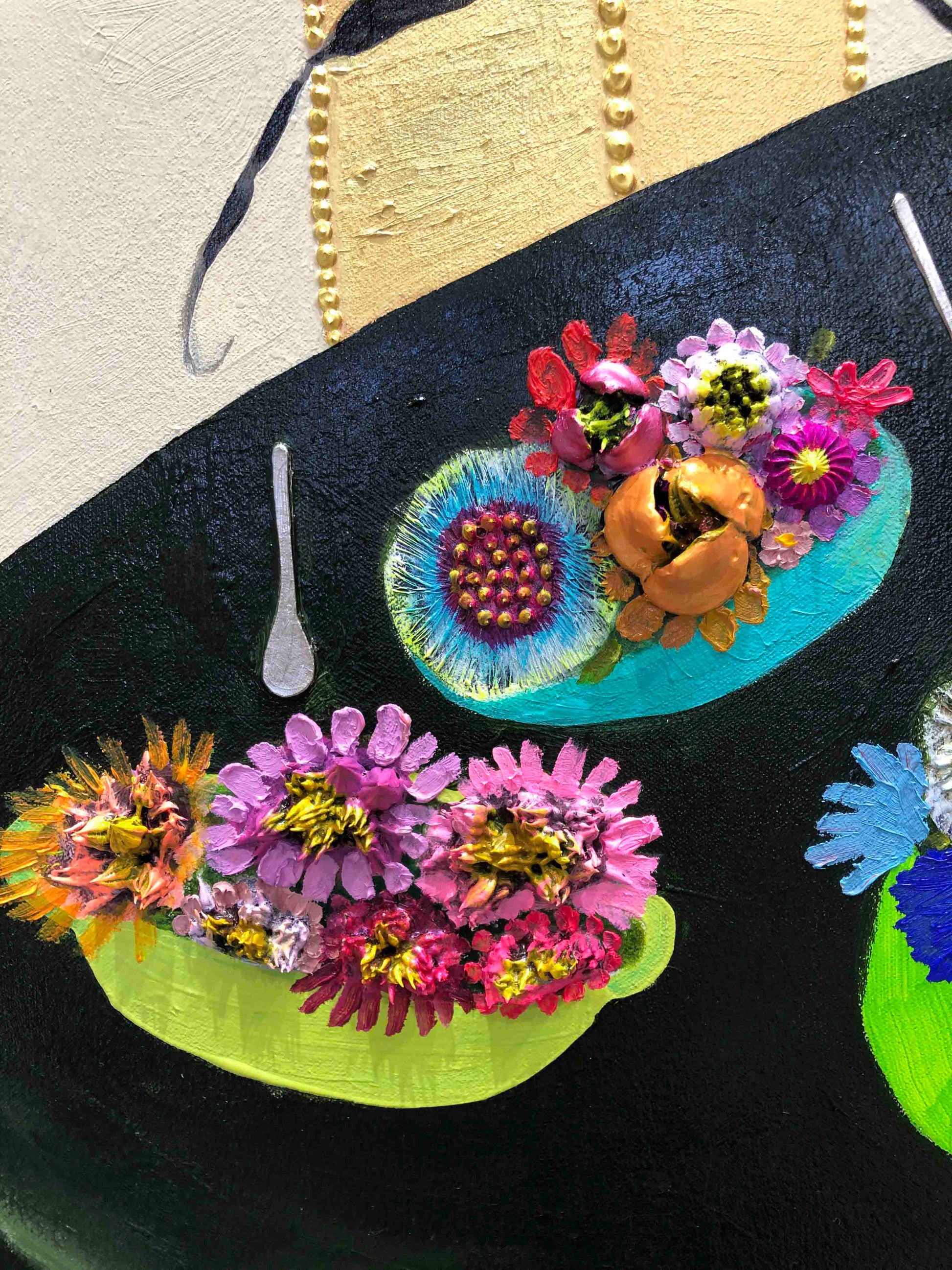 Oil, acrylic, wood, sterling silver leaf, palladium leaf, 24k gold leaf, fabric, water colors, chipboard, ribbons, glass, sand, glitter, a pearl, and found objects on a hand made heavy duty 3" thick canvas.