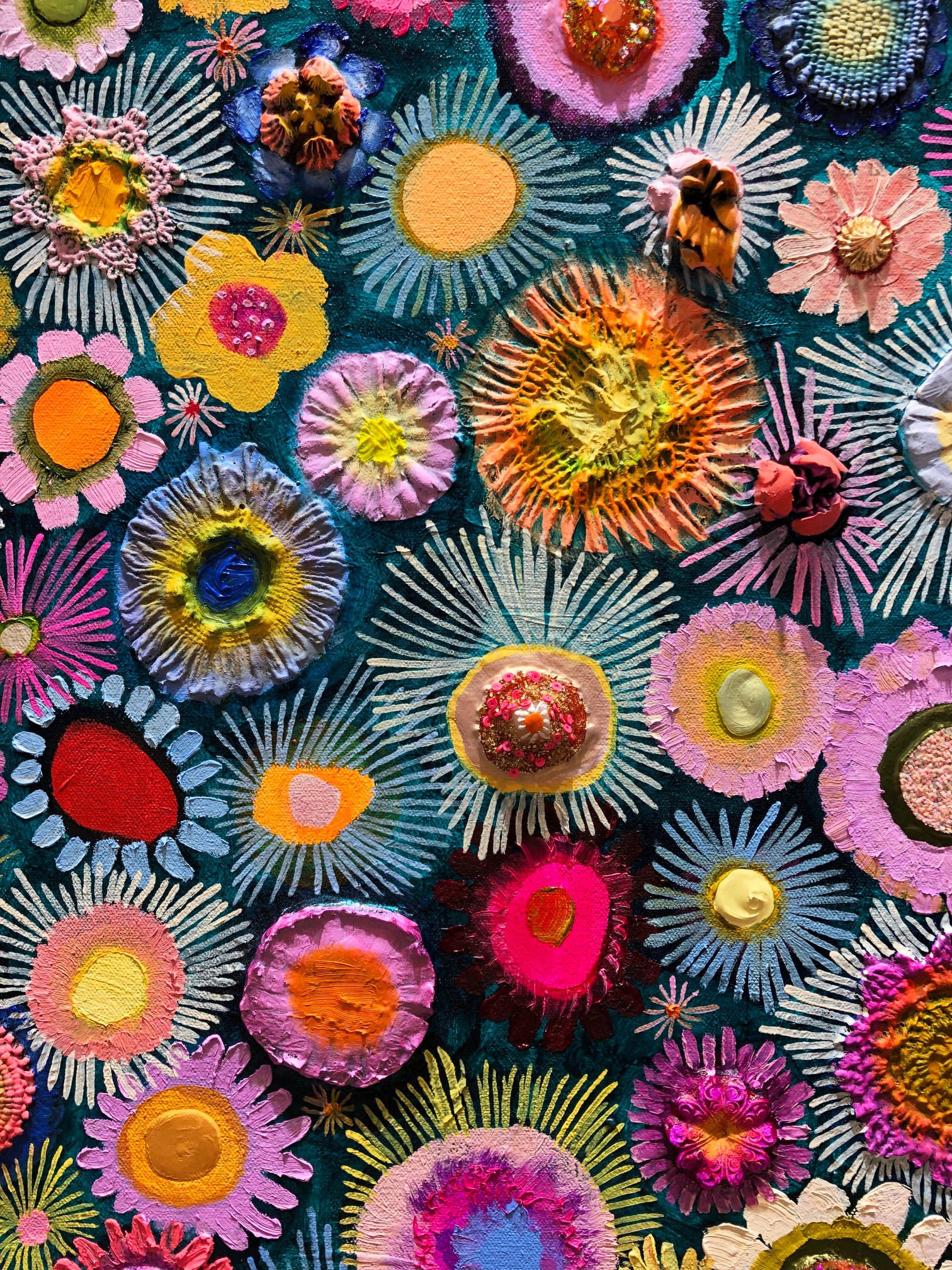 Oil, acrylic, fabric, lace and found objects on a hand-made heavy-duty canvas.