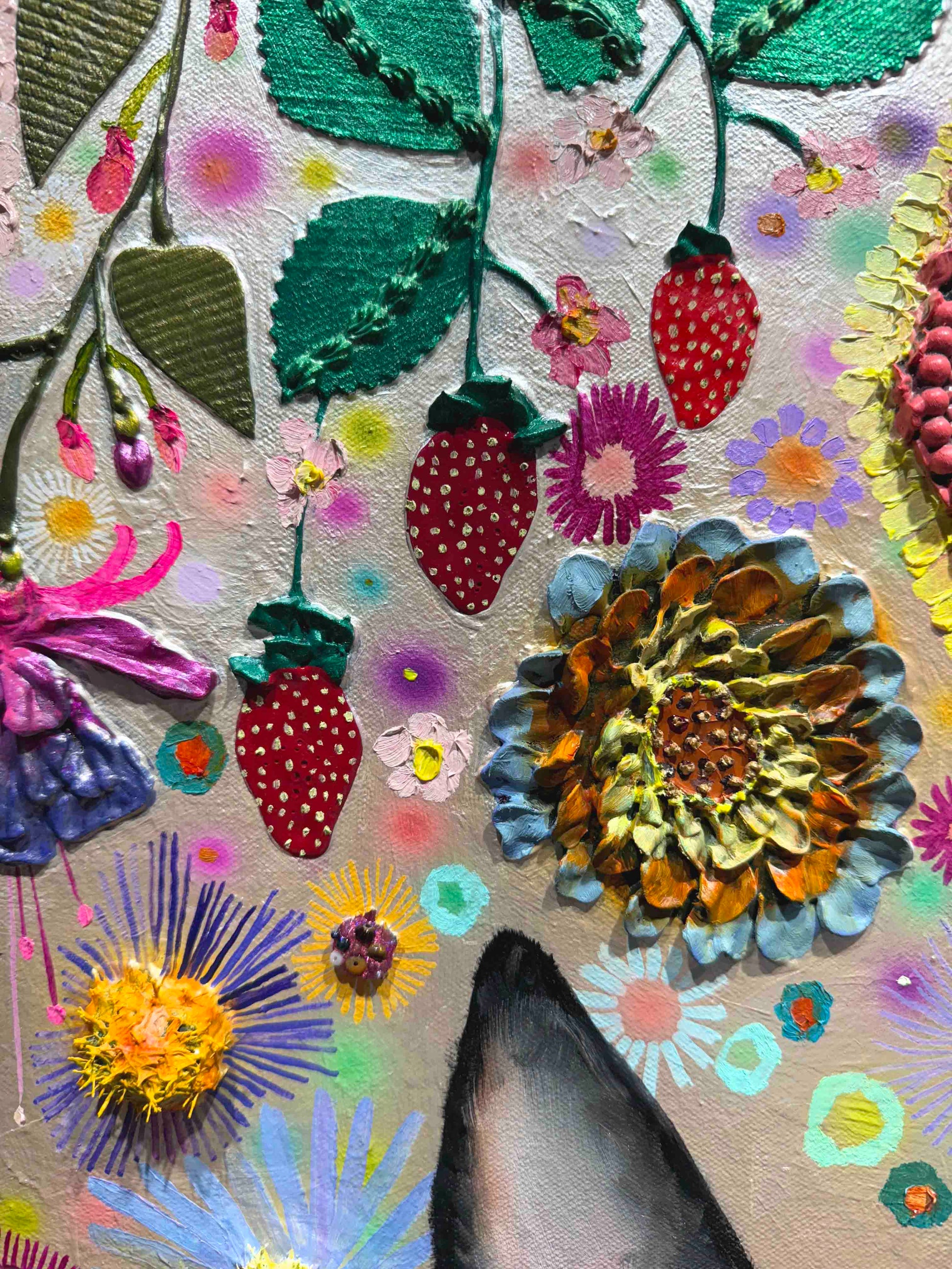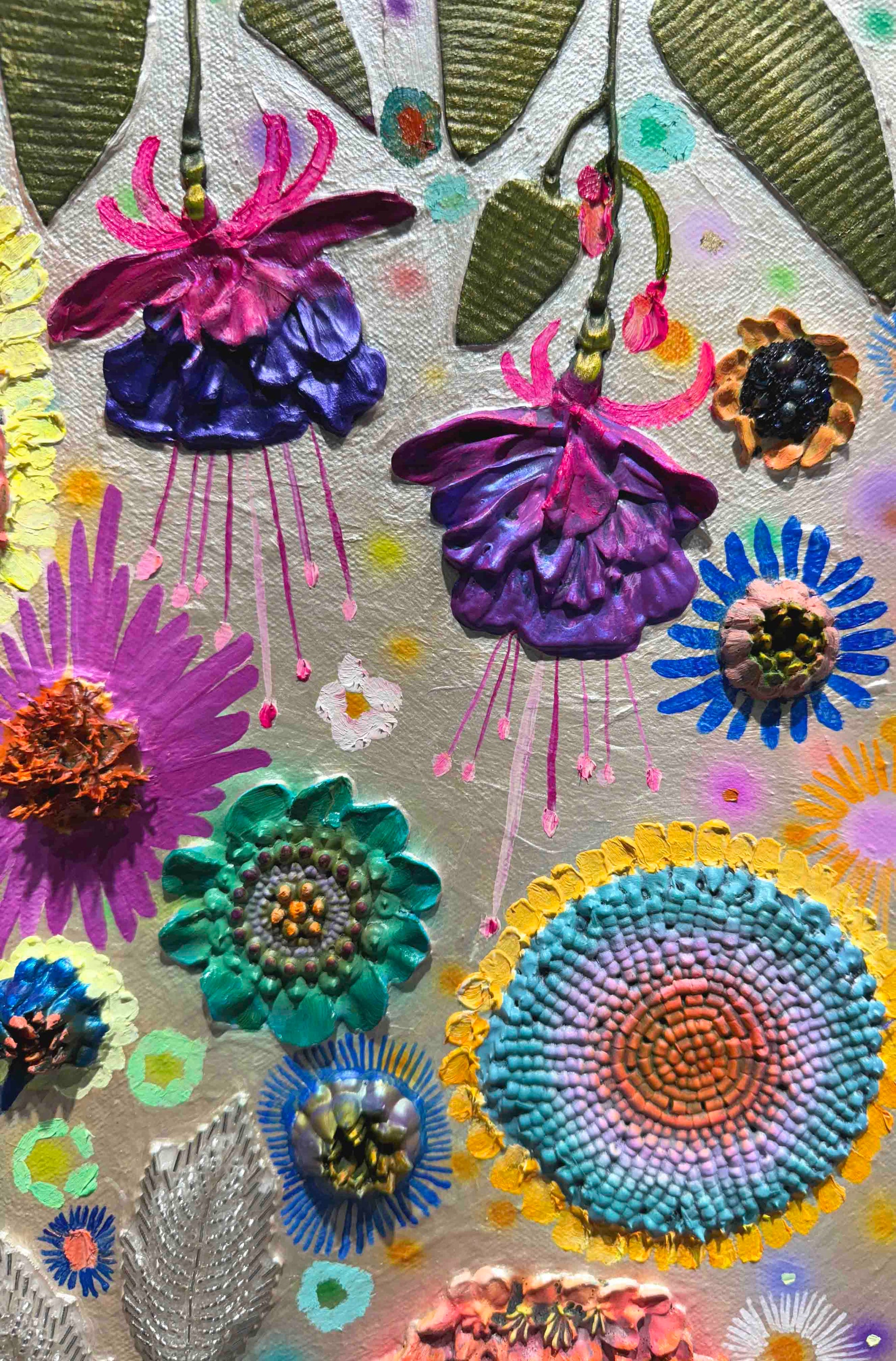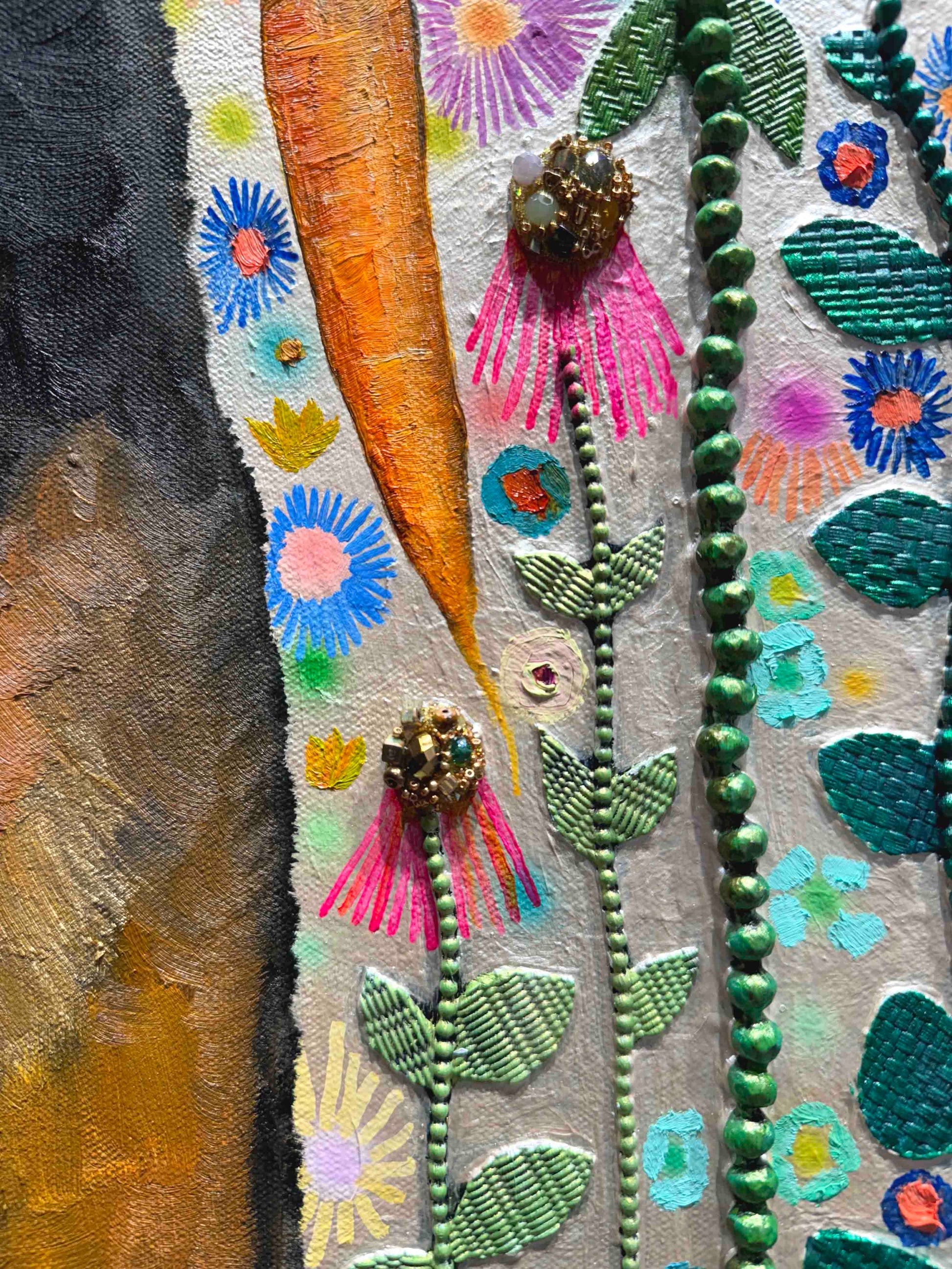 Oil, acrylic, yarn, fabric, paper, and found objects on a handmade canvas.