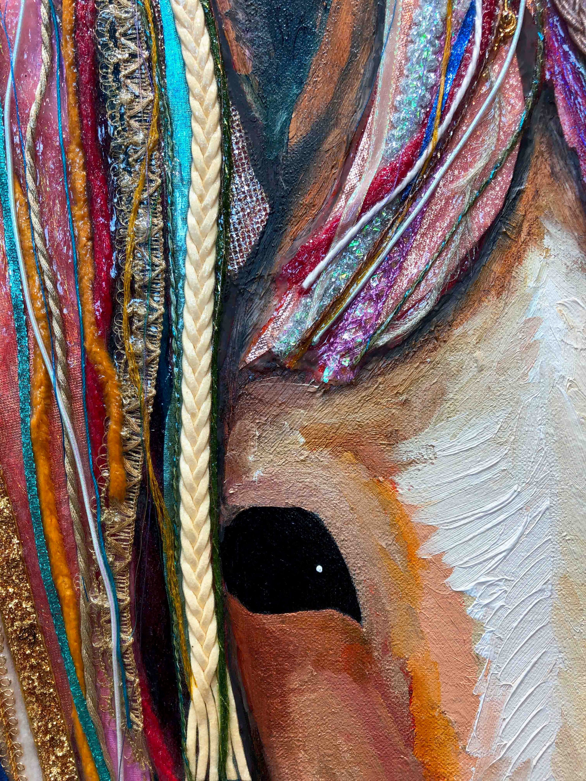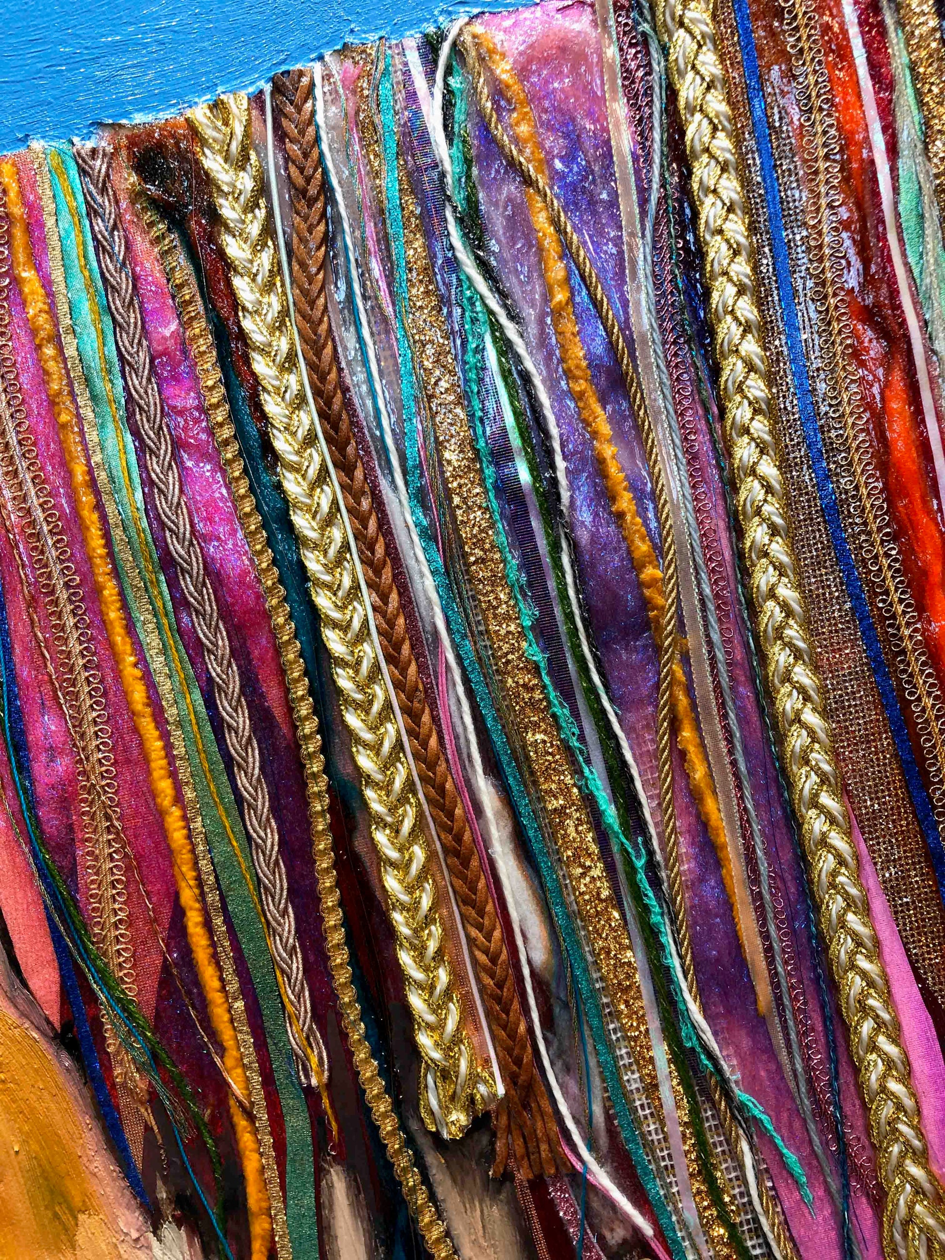 Oil, acrylic, fabric, yarn, ribbon and lace on a handmade heavy-duty canvas.