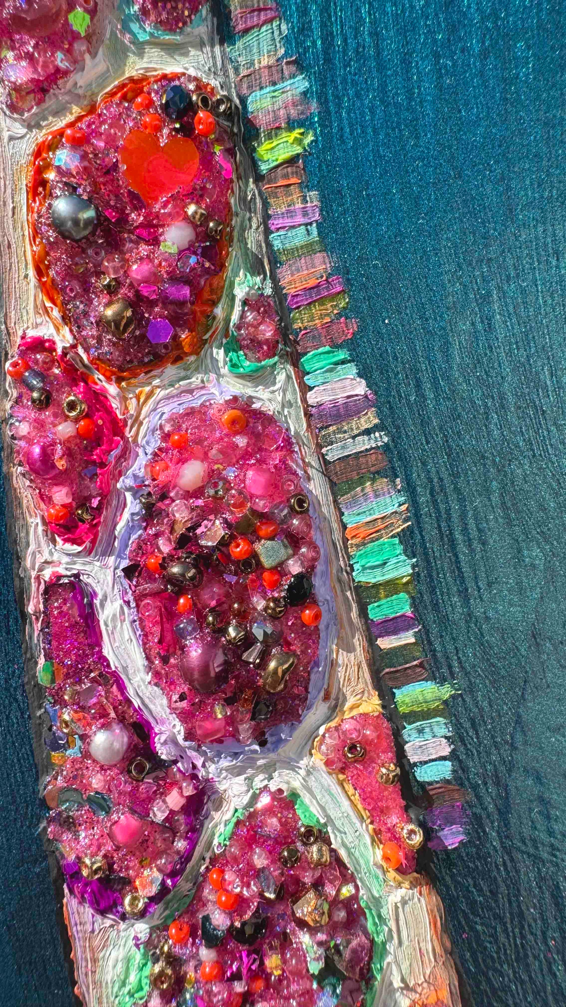 Oil, acrylic, glass, sand, mica, glitter, pearls and found objects on a .75" birch wood panel.