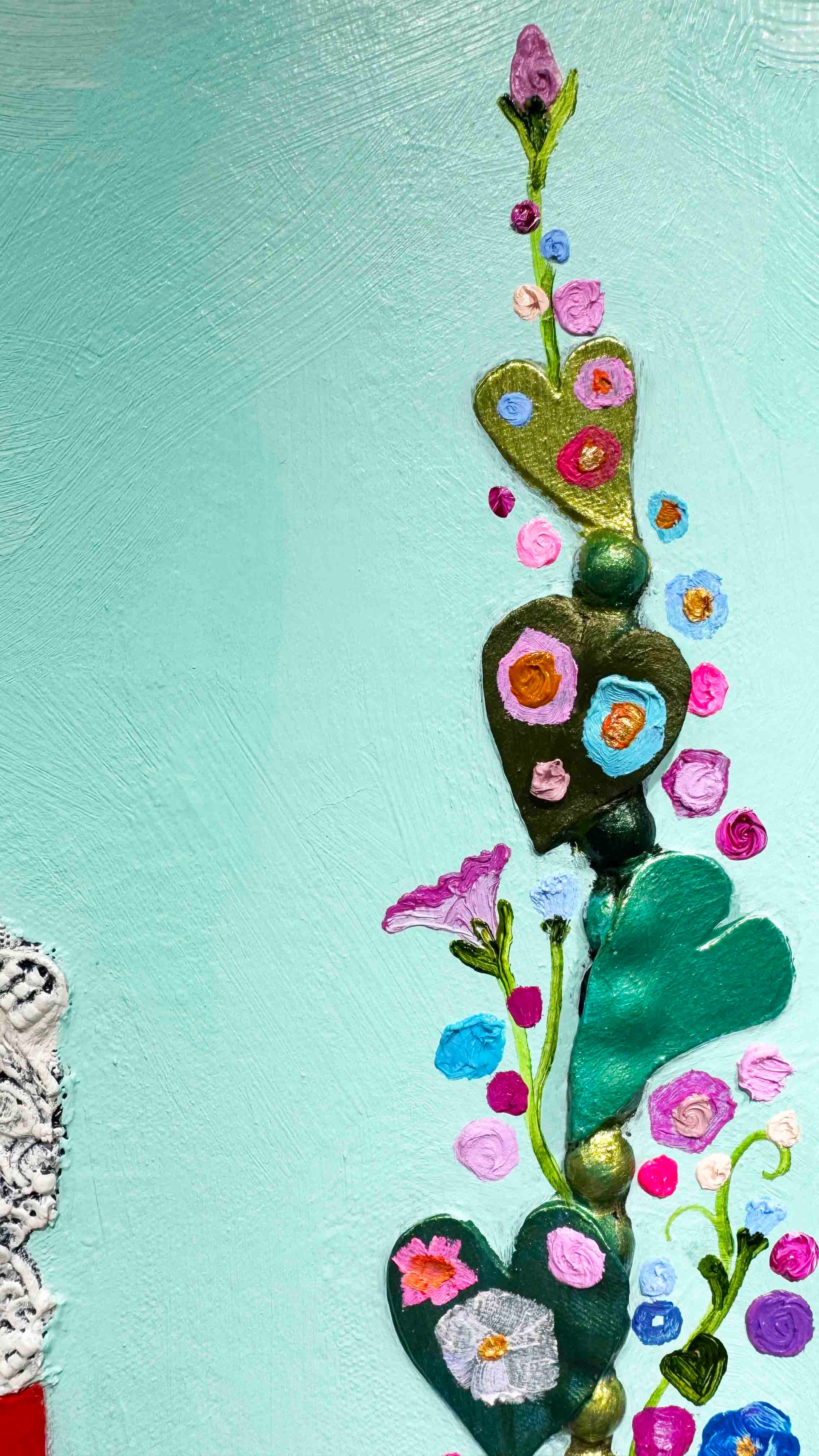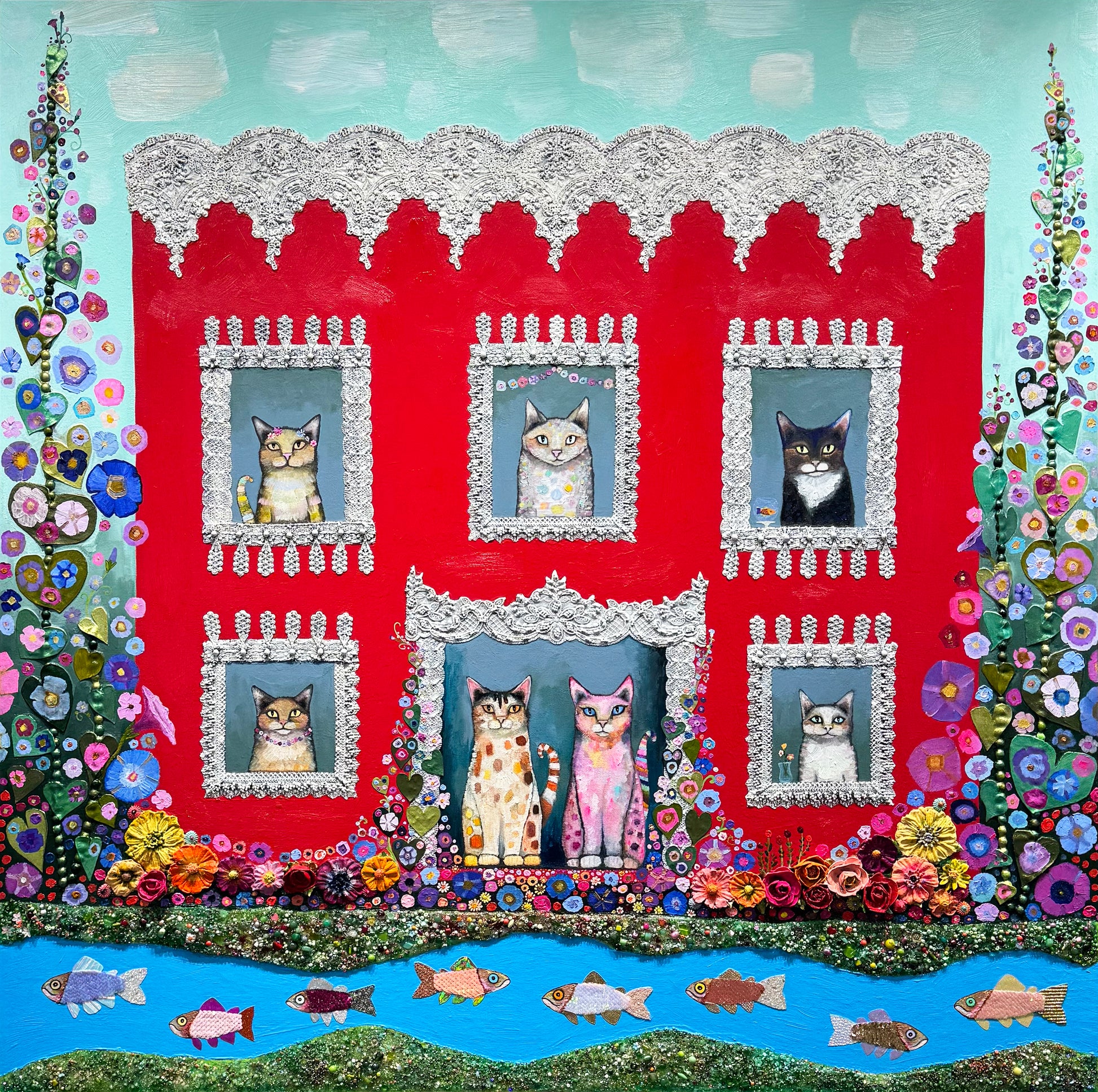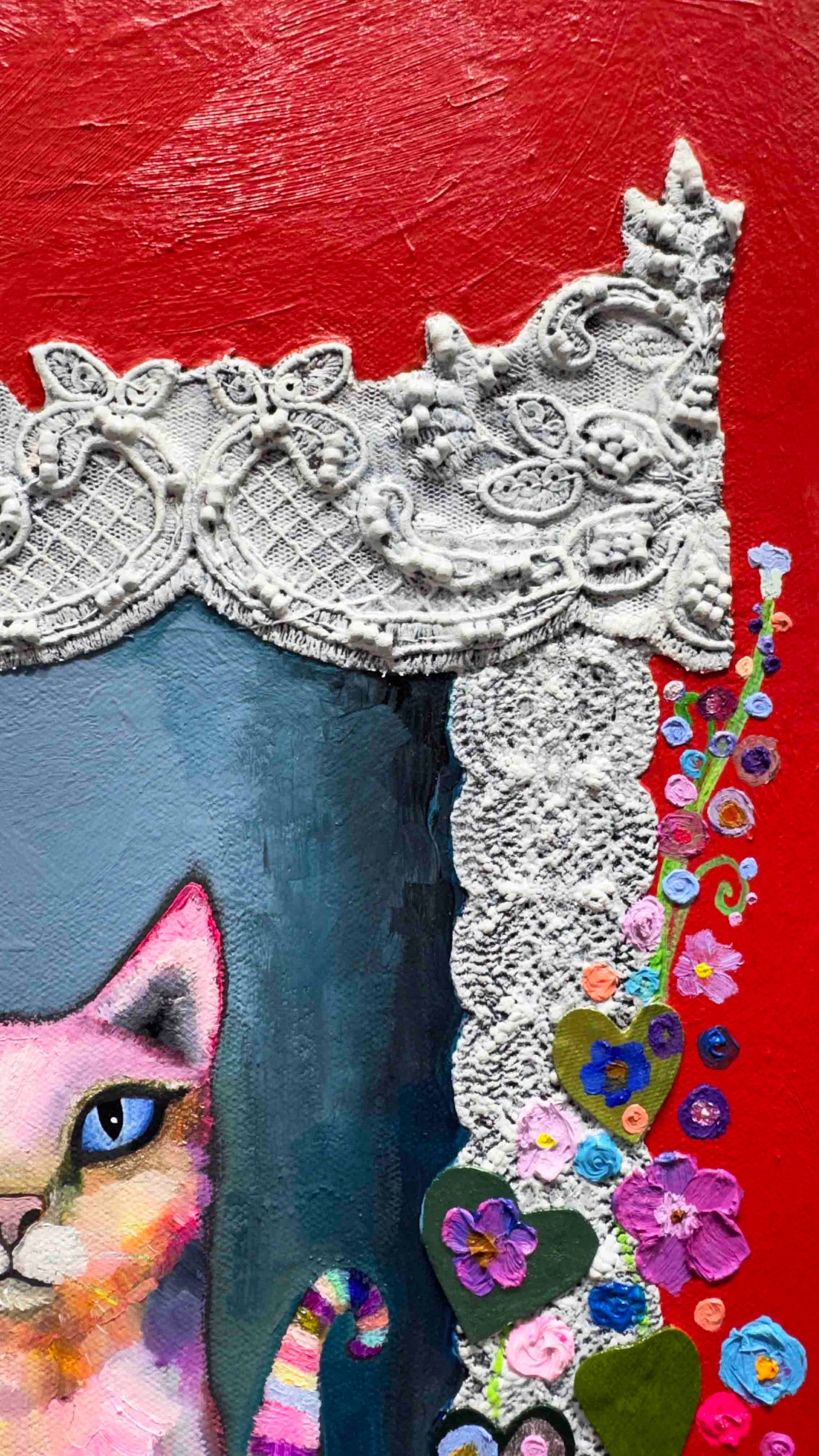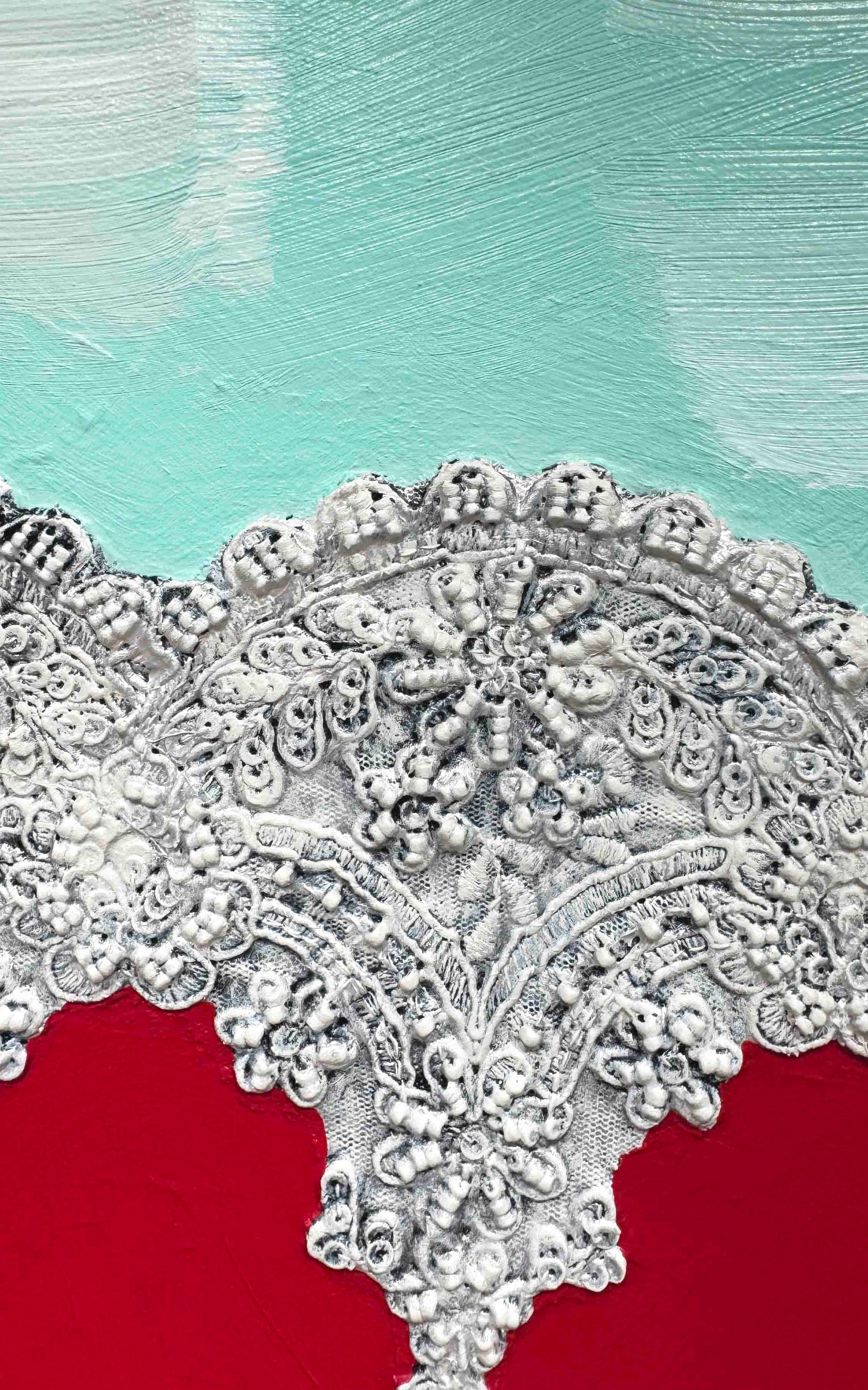 Oil, acrylic, lace, pearls, fabric, glass, sand and found objects on a 2.25" thick handmade, heavy-duty canvas.