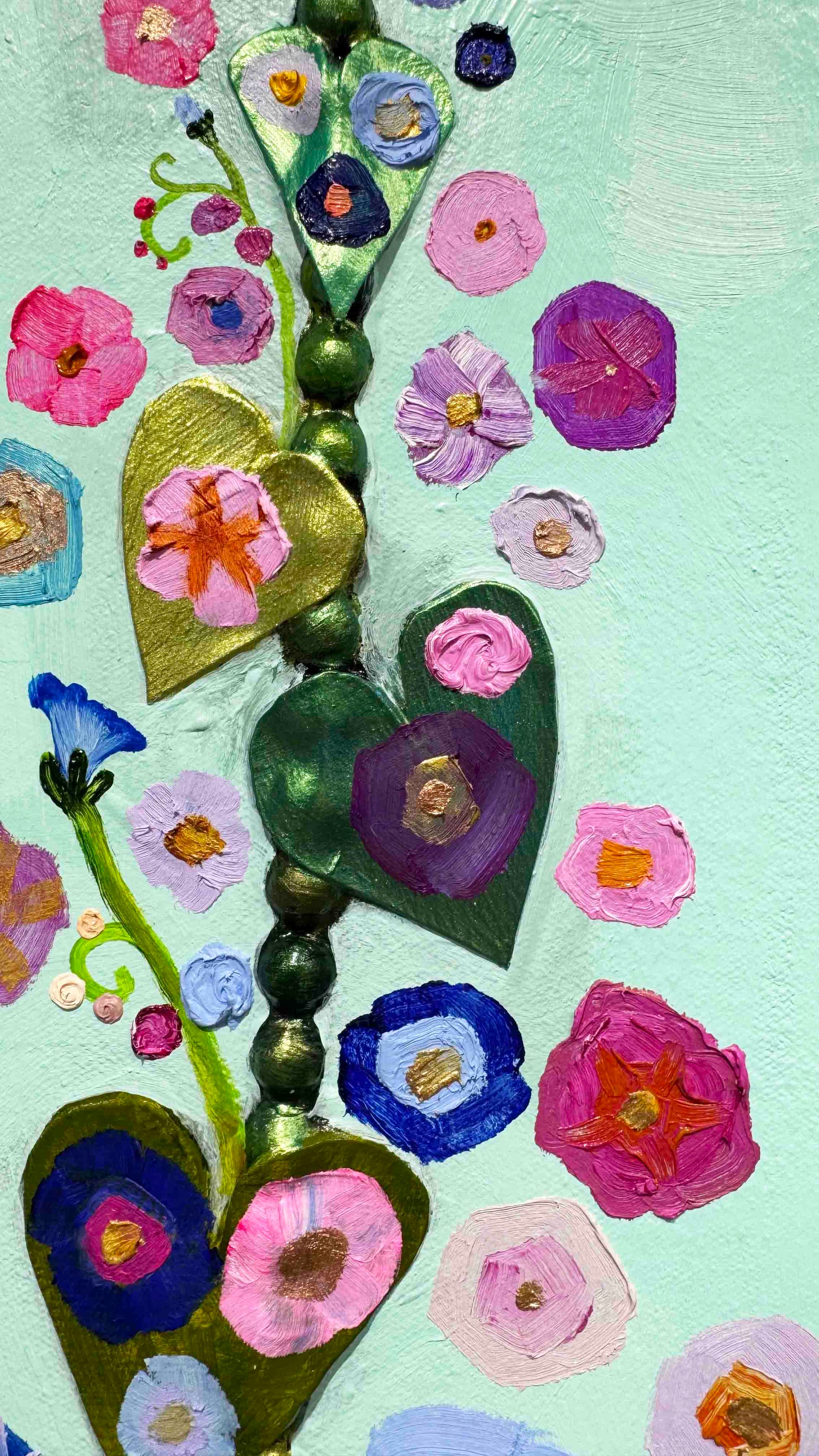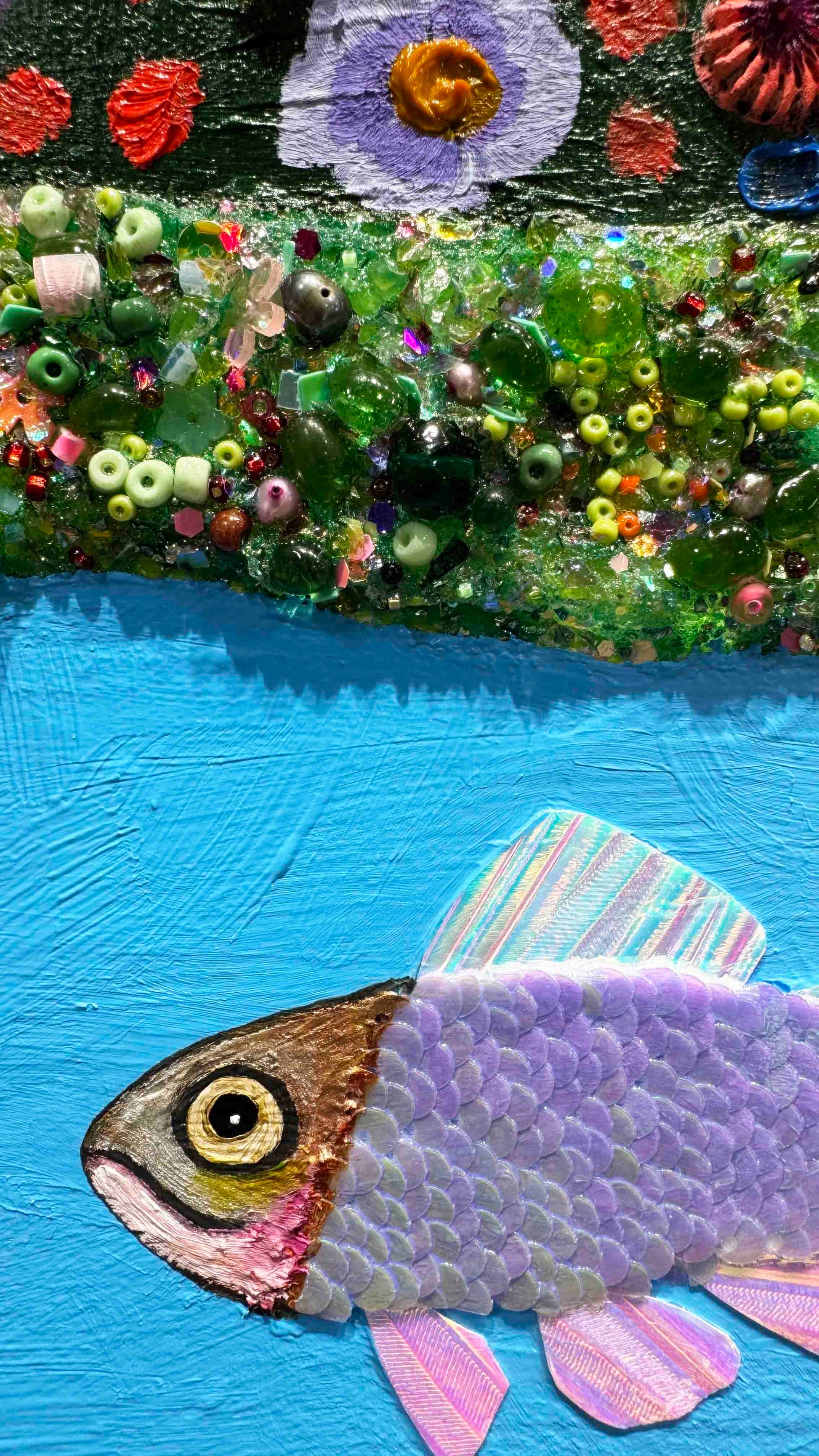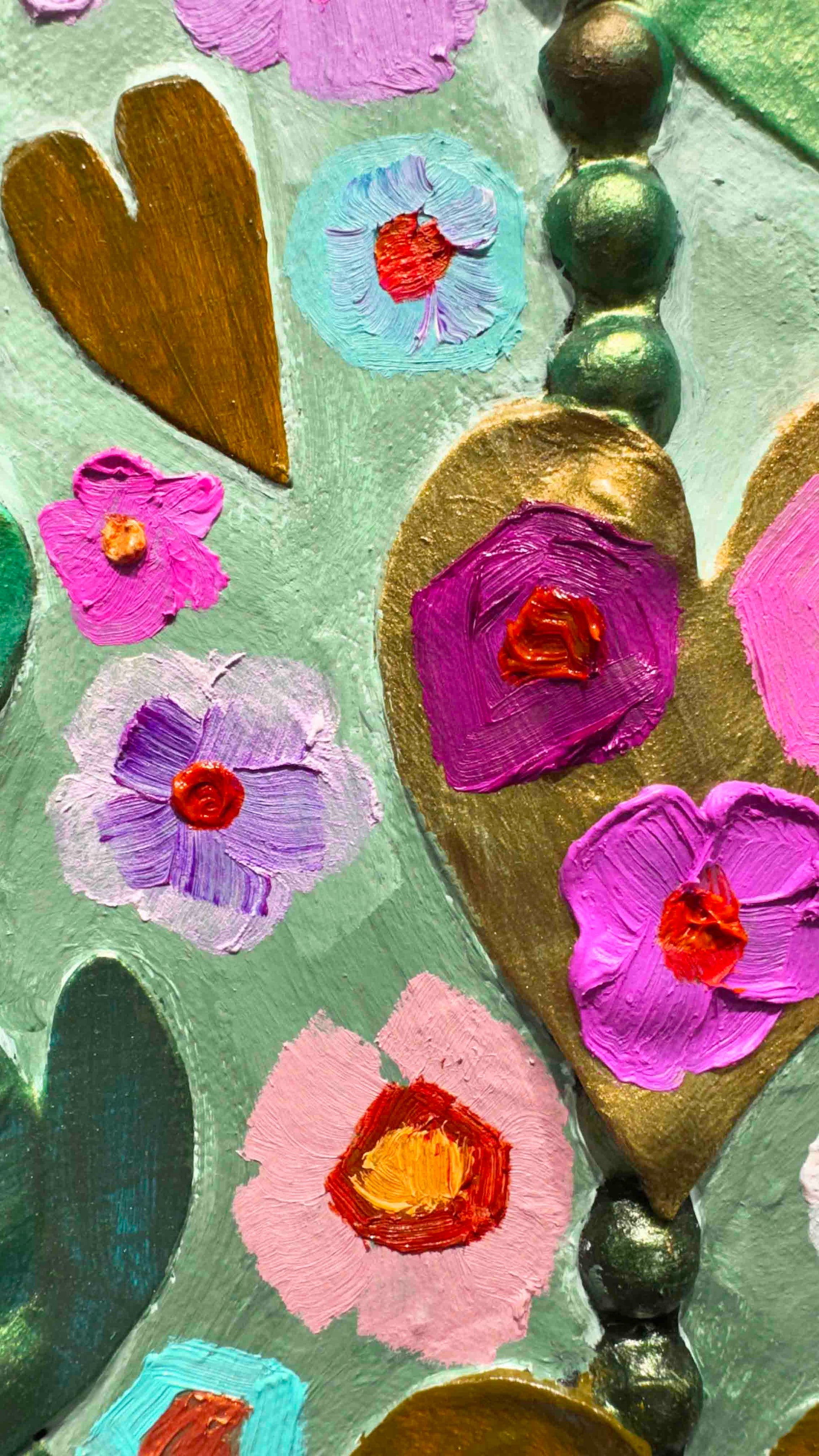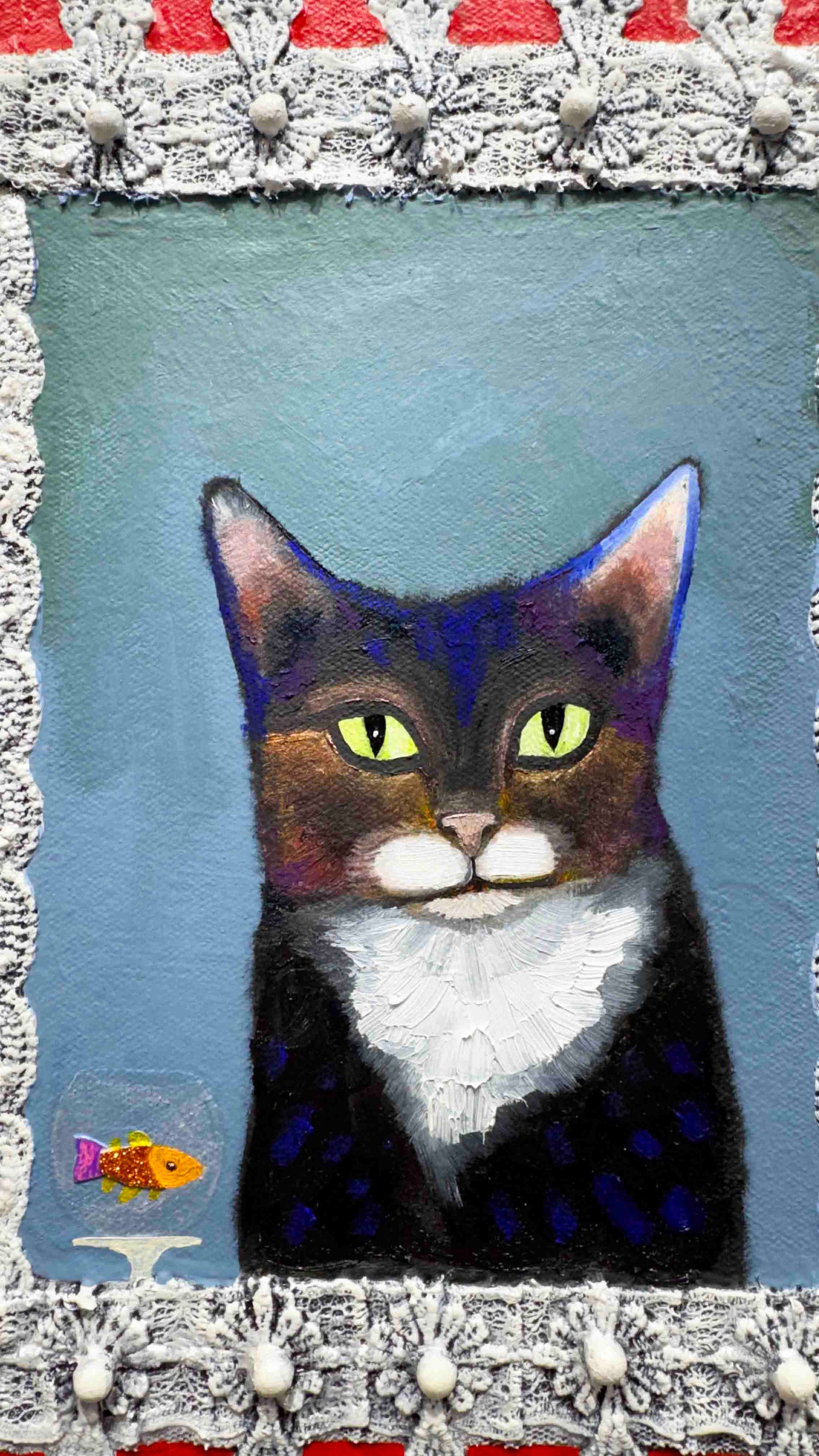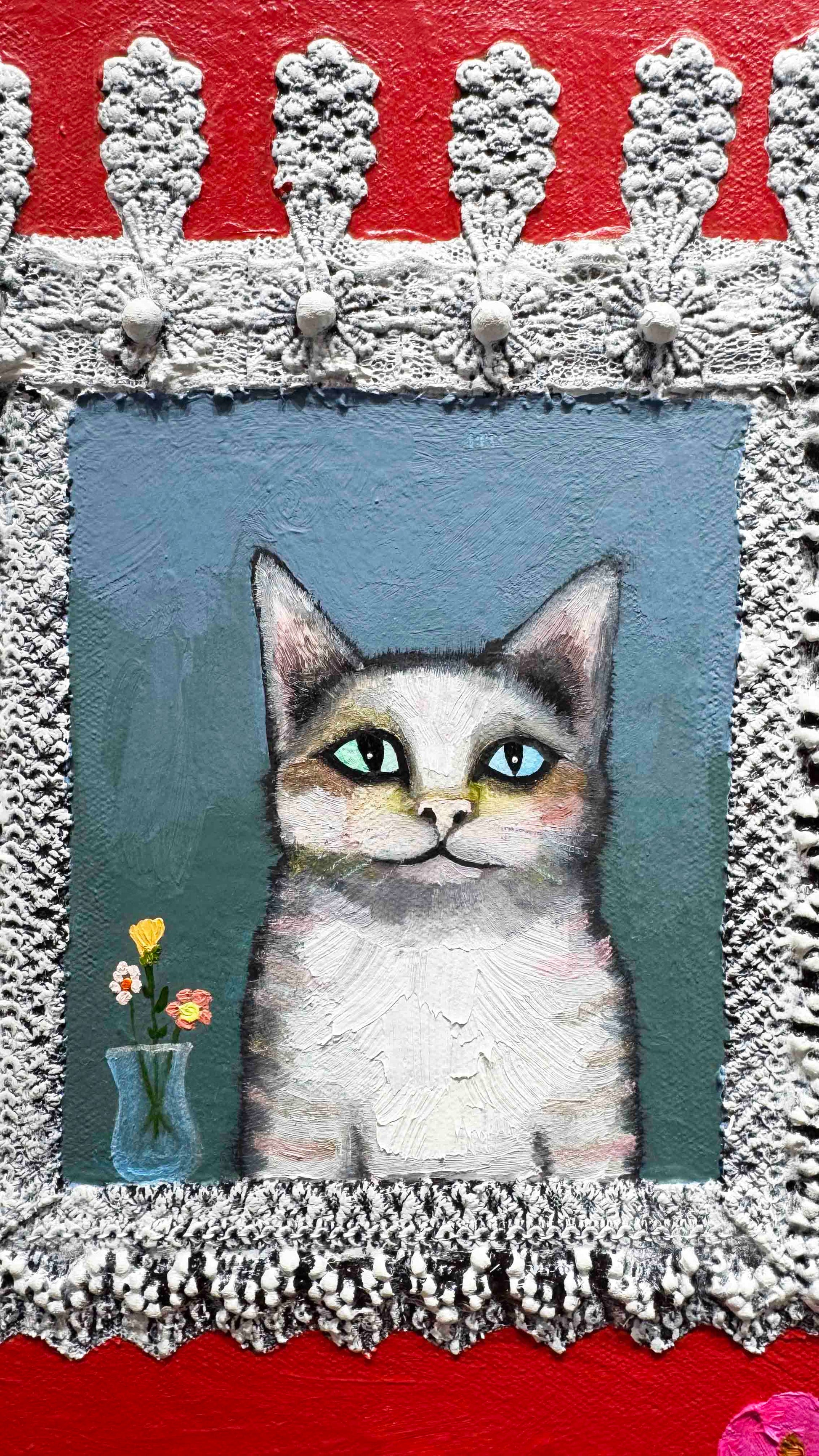 Oil, acrylic, lace, pearls, fabric, glass, sand and found objects on a 2.25" thick handmade, heavy-duty canvas.