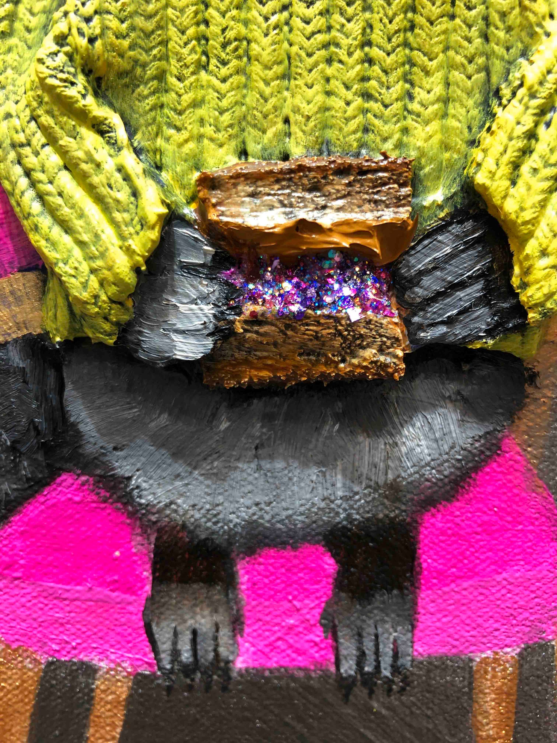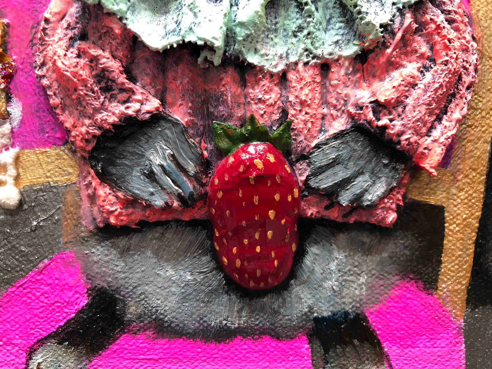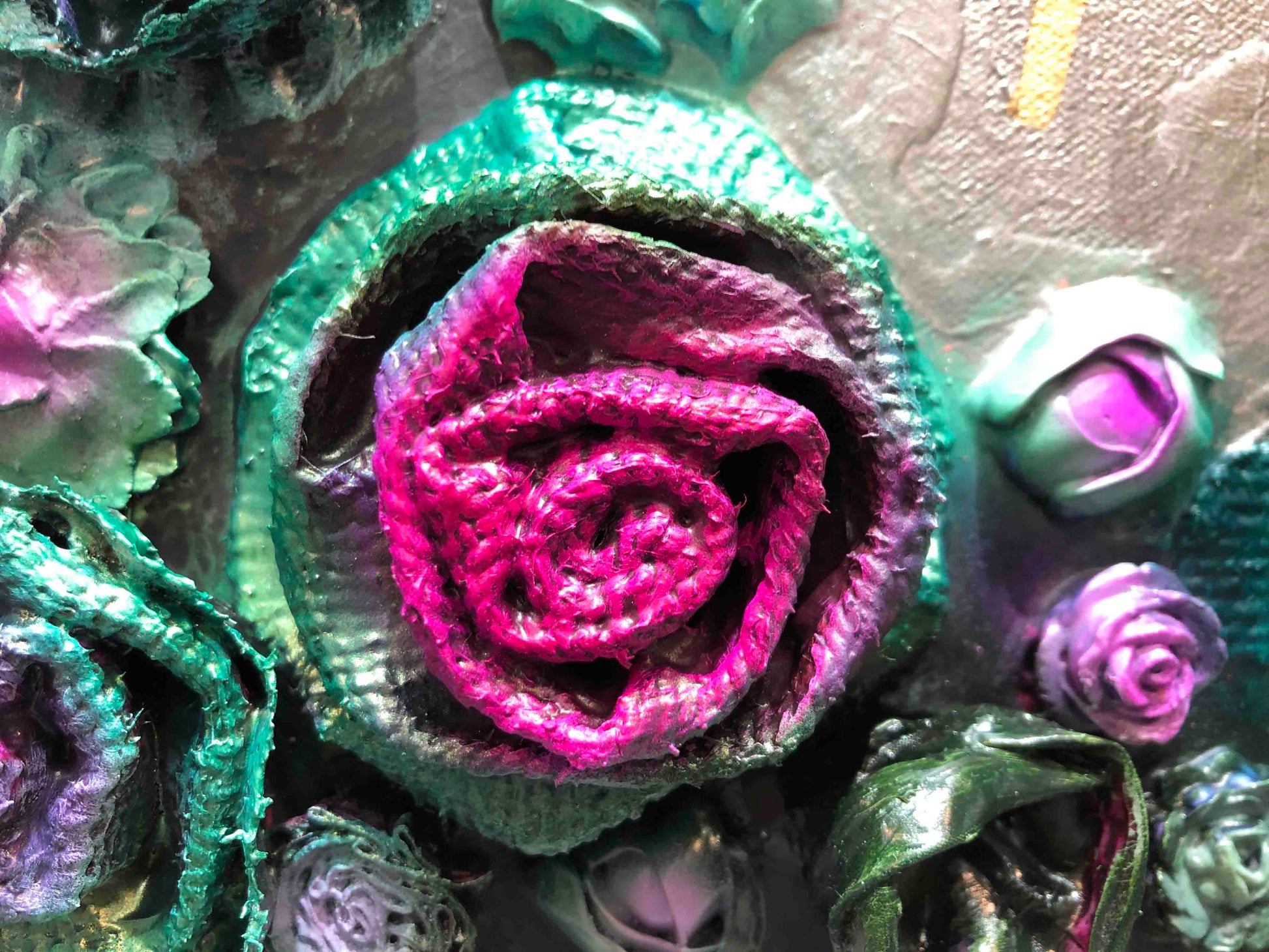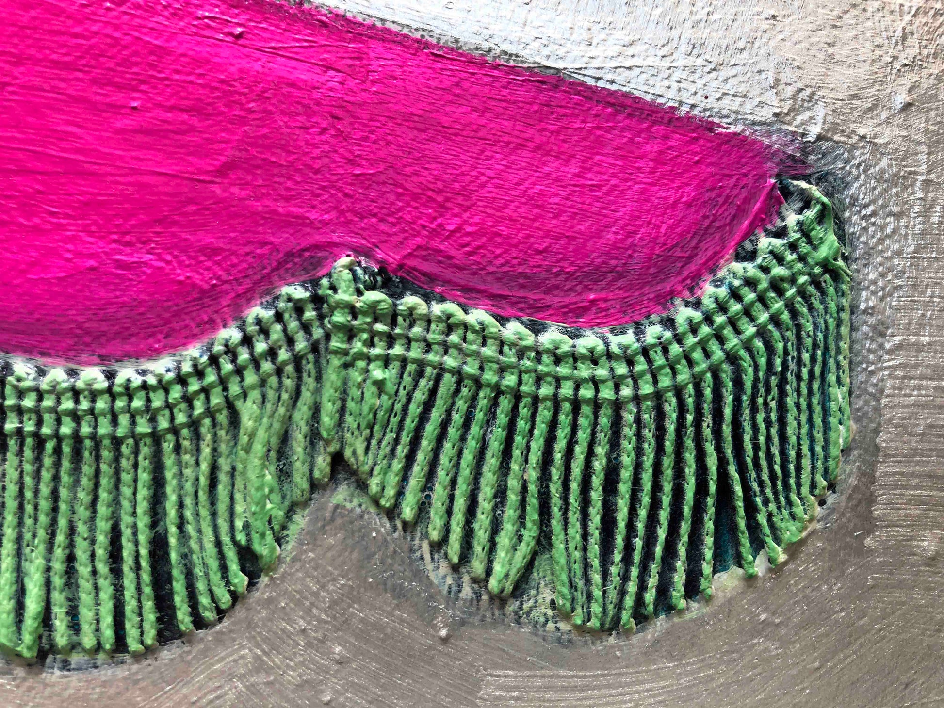 Oil, acrylic, lace, ribbon, fringe, glitter, fabric and found objects on a handmade heavy duty canvas.