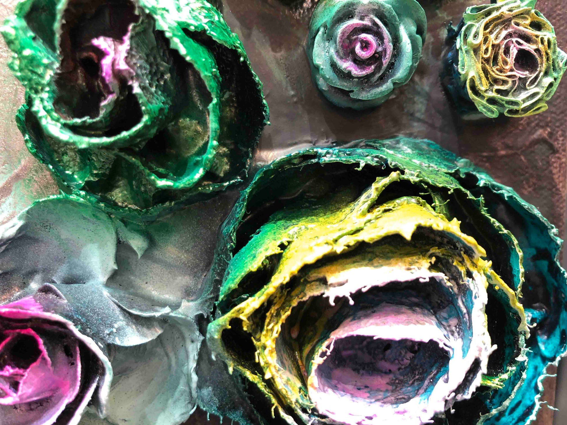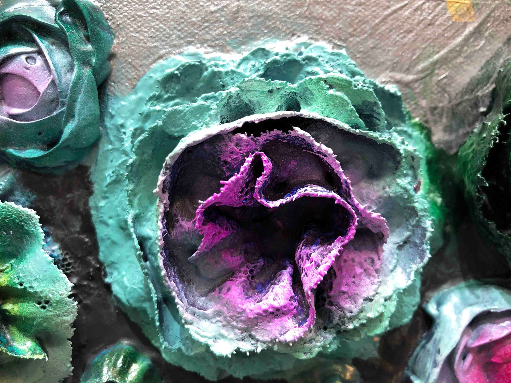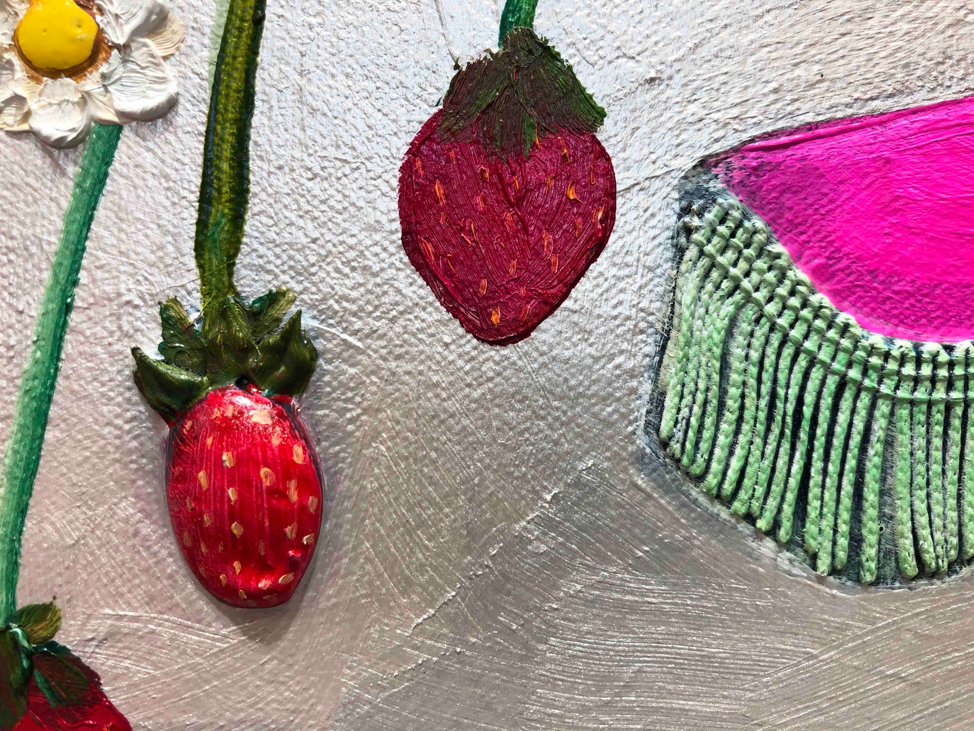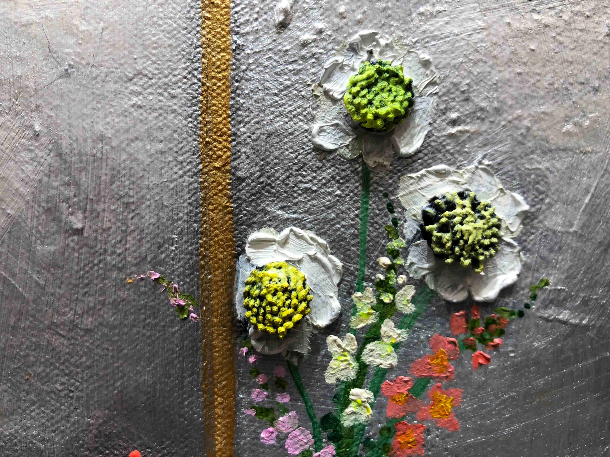 Oil, acrylic, lace, ribbon, fringe, glitter, fabric and found objects on a handmade heavy duty canvas.