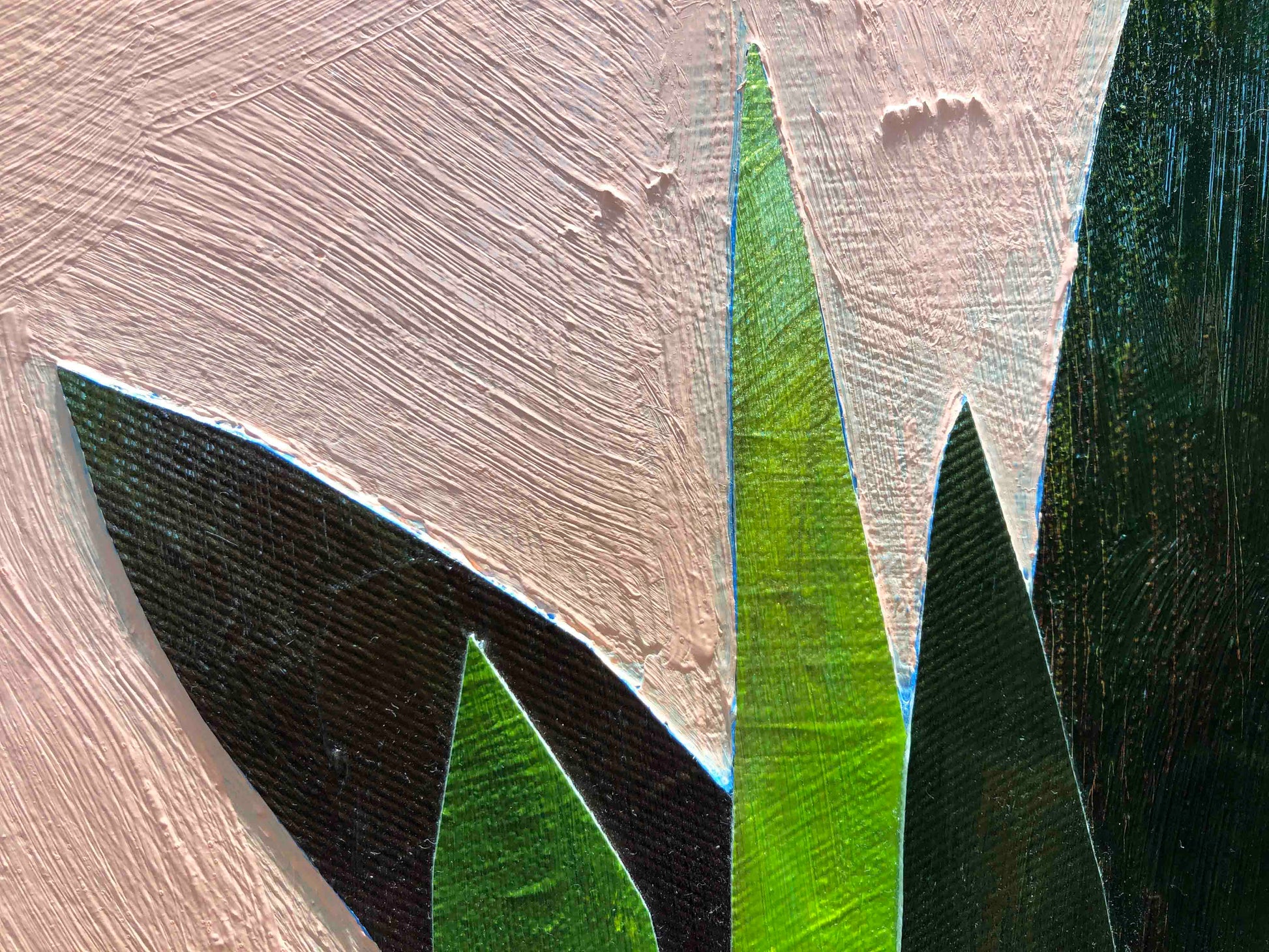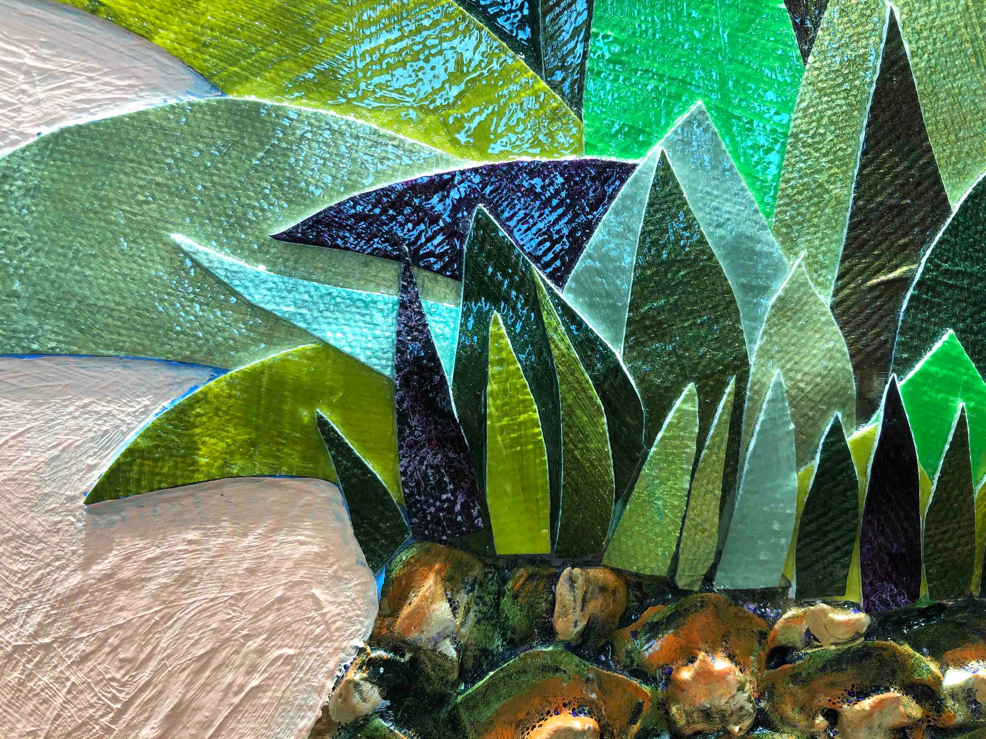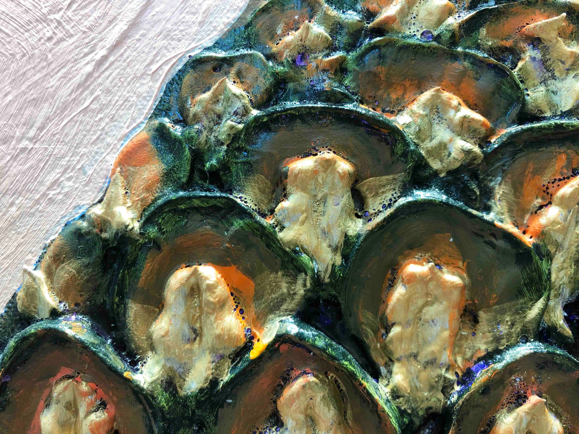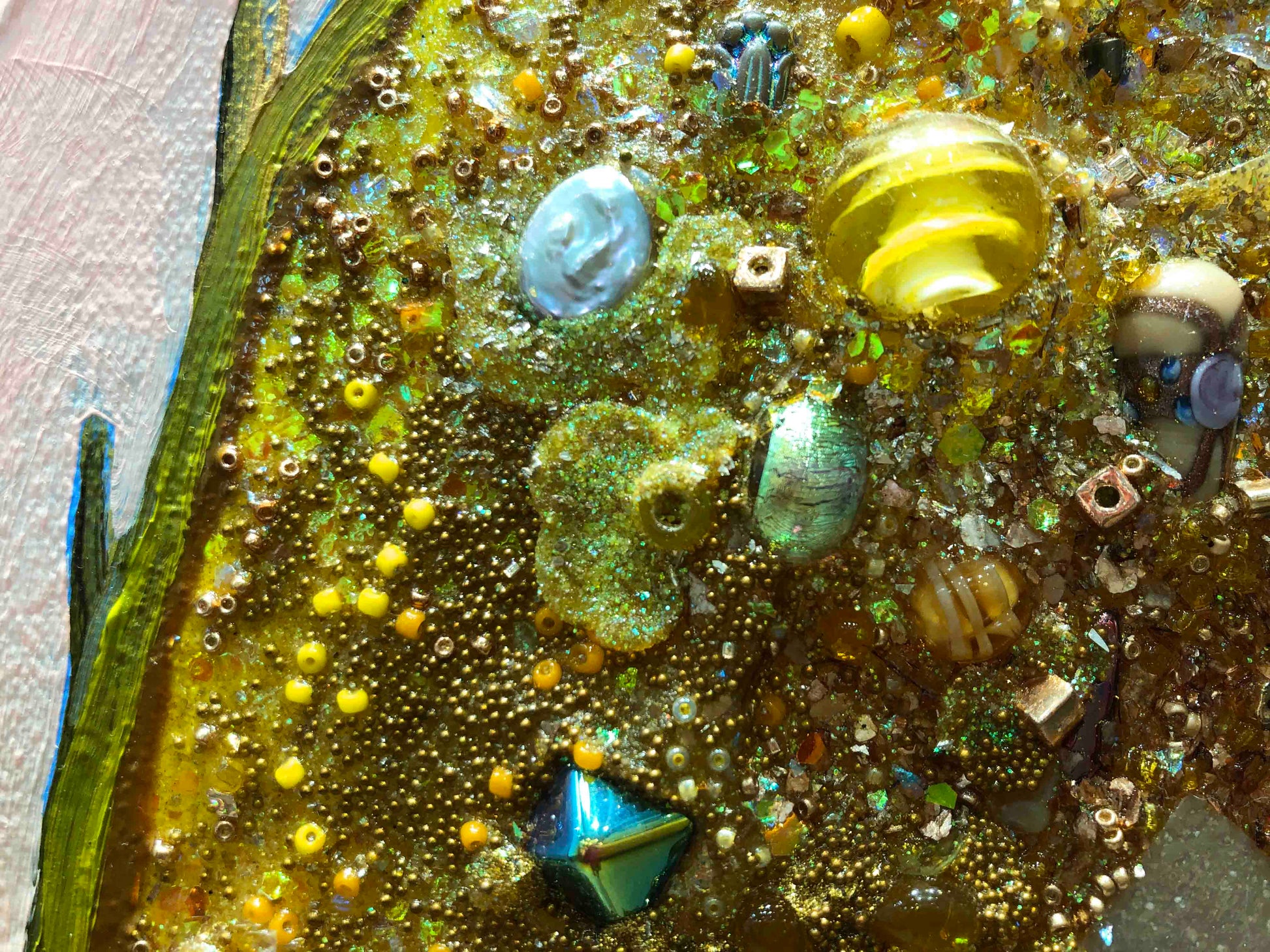Oil, acrylic, fabric, glass, gemstones, pearls, glitter, sand and found objects on a hand made heavy duty 3" thick canvas.