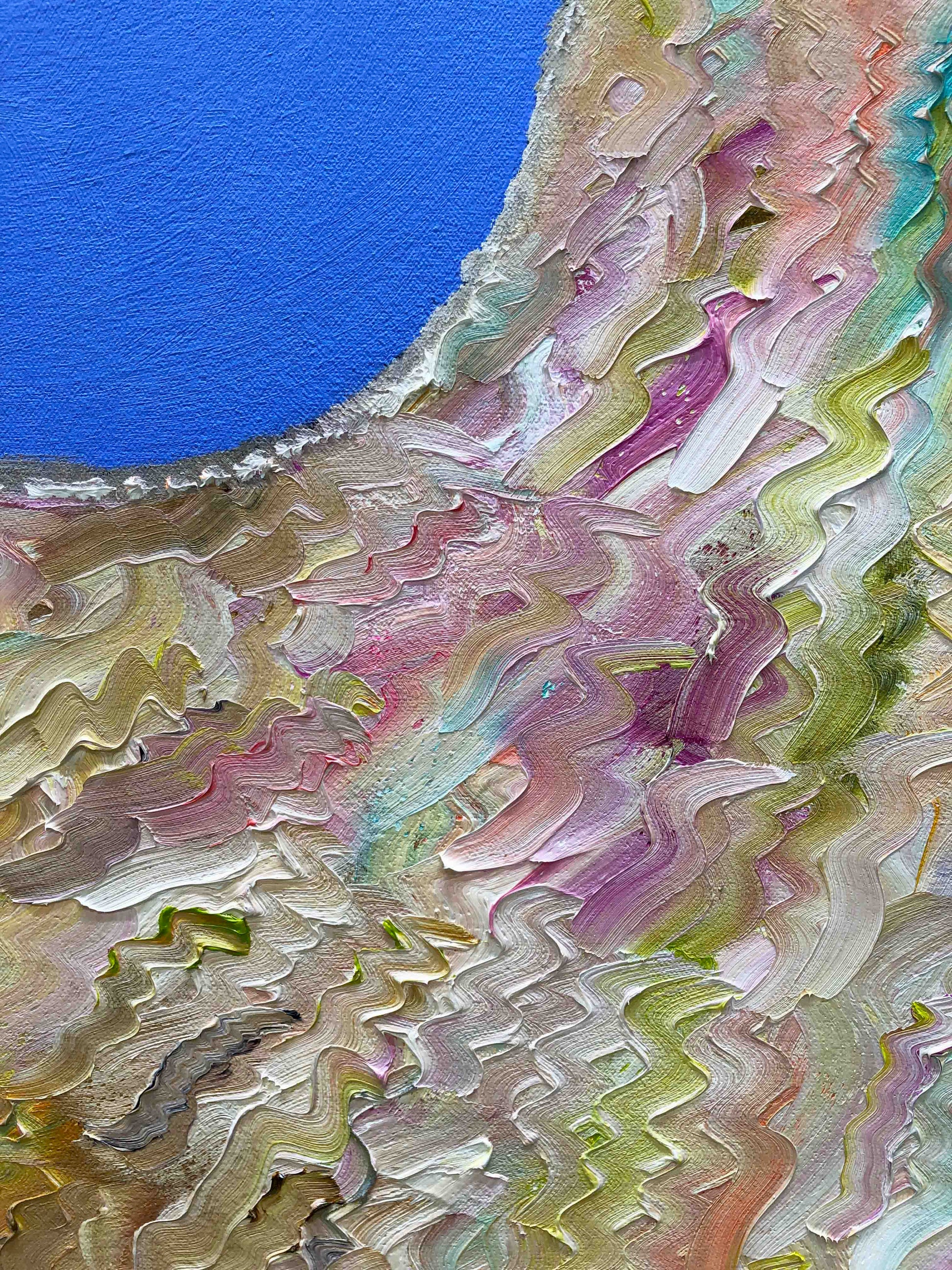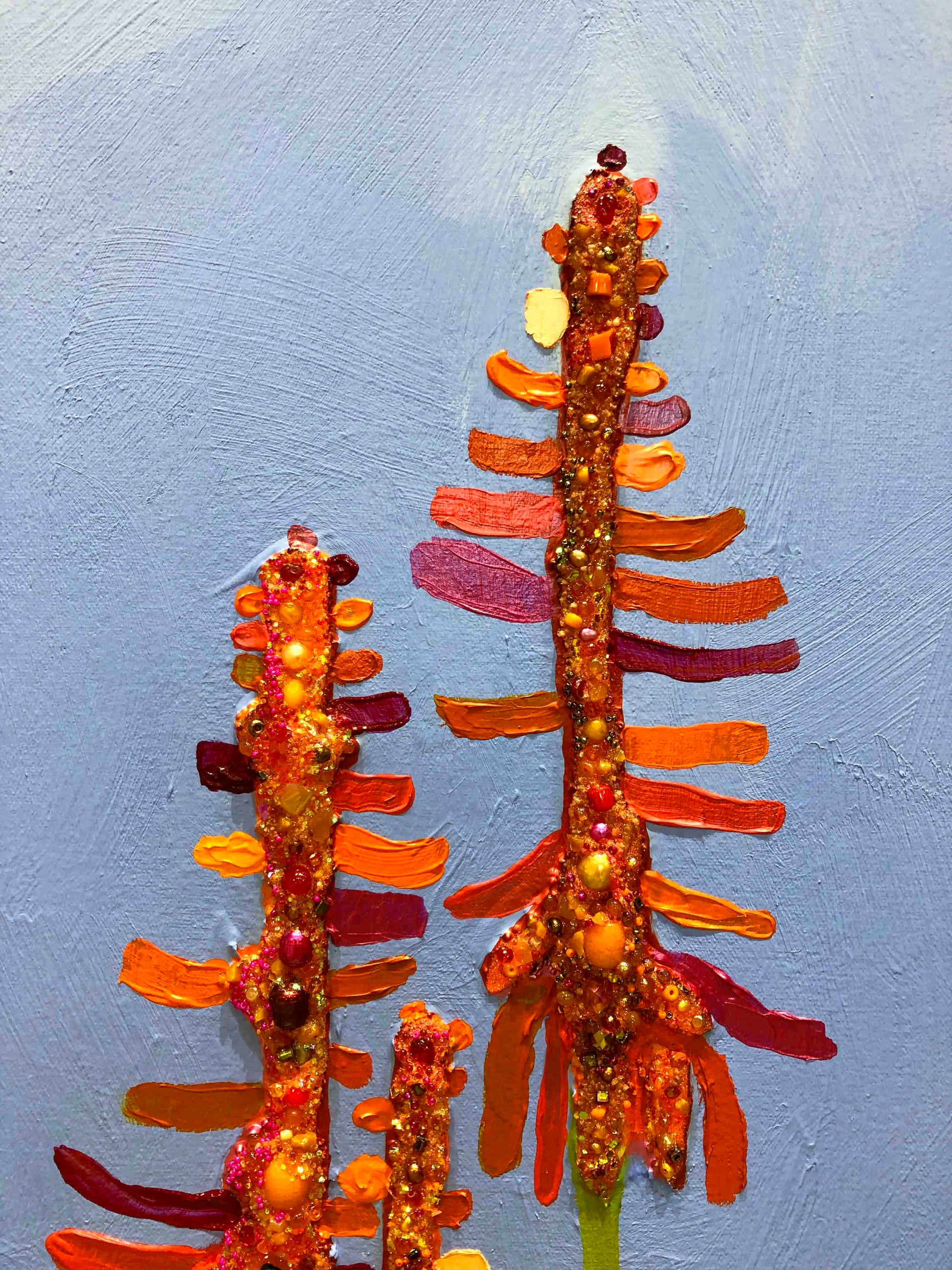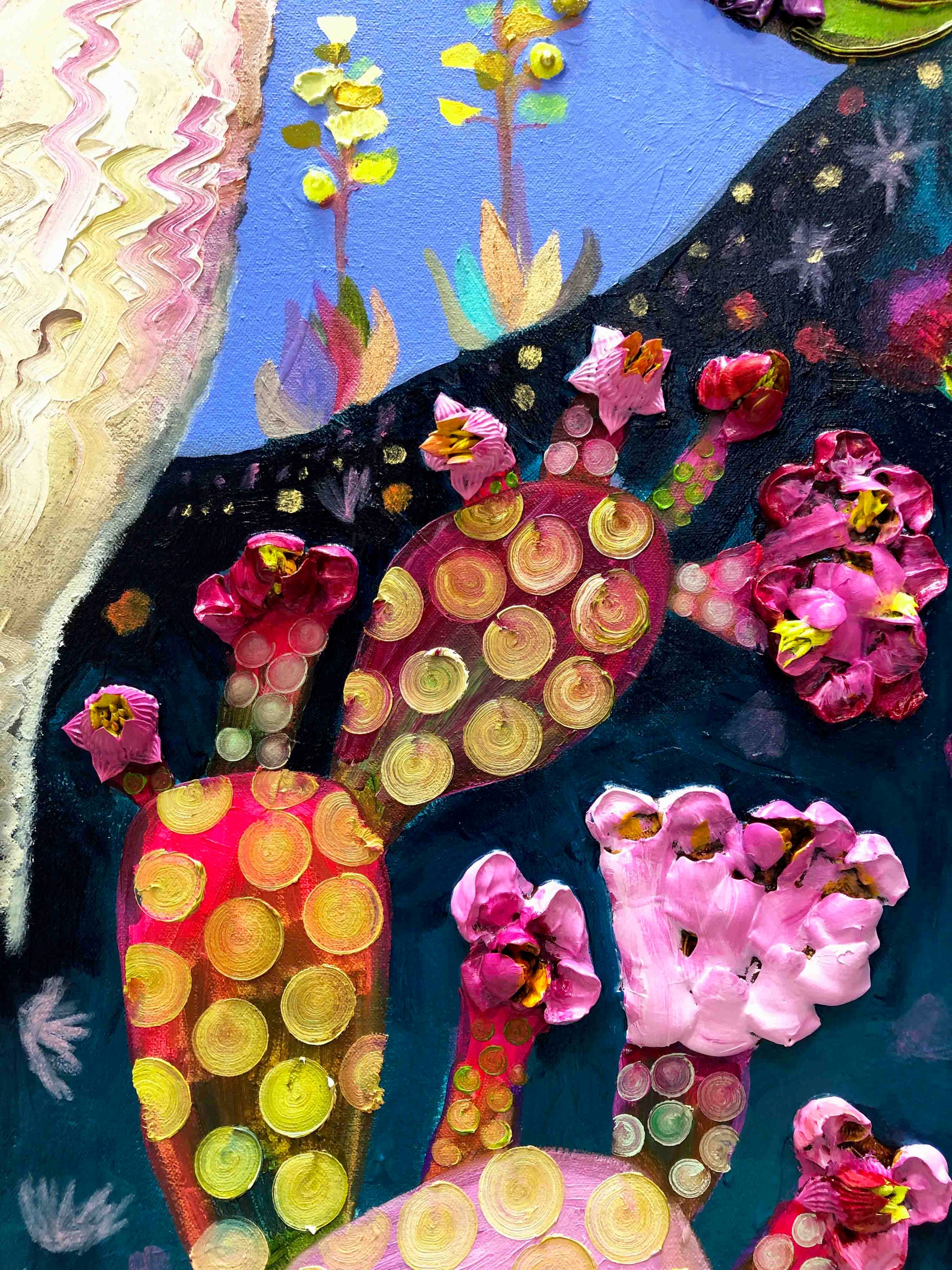 Oil, acrylic, pearls, sand, glass, glitter, gemstones and found objects on a hand made heavy duty canvas.