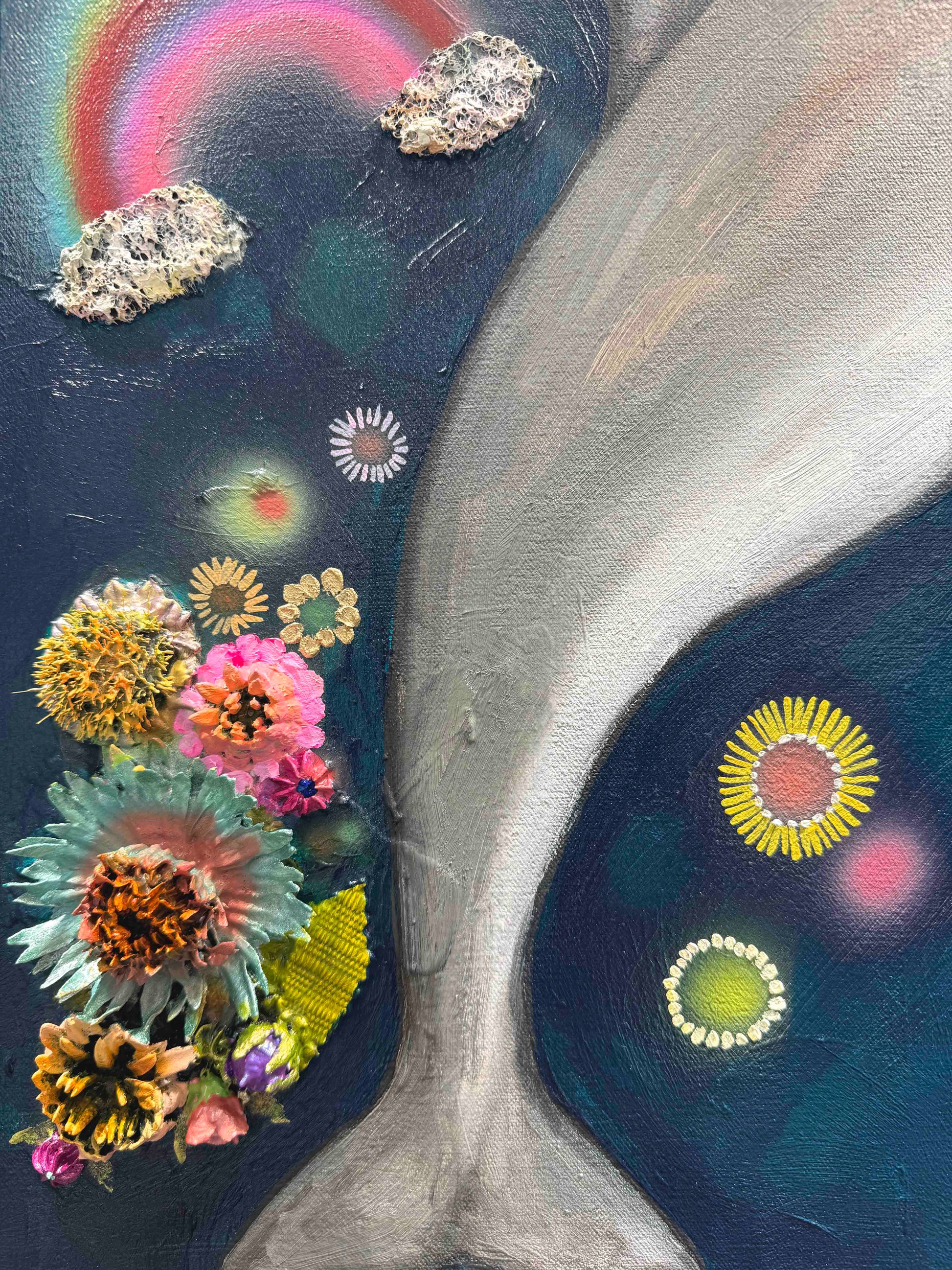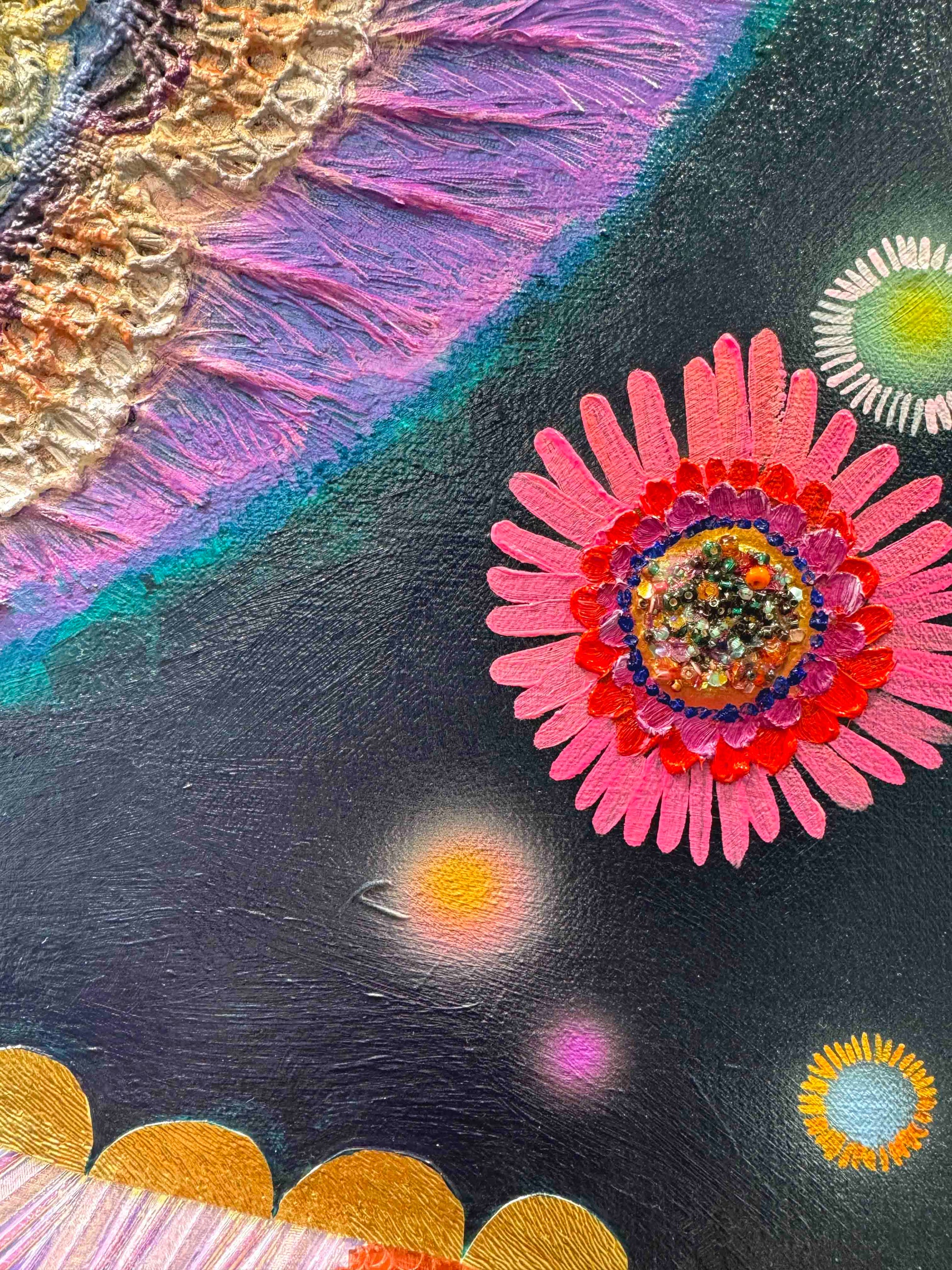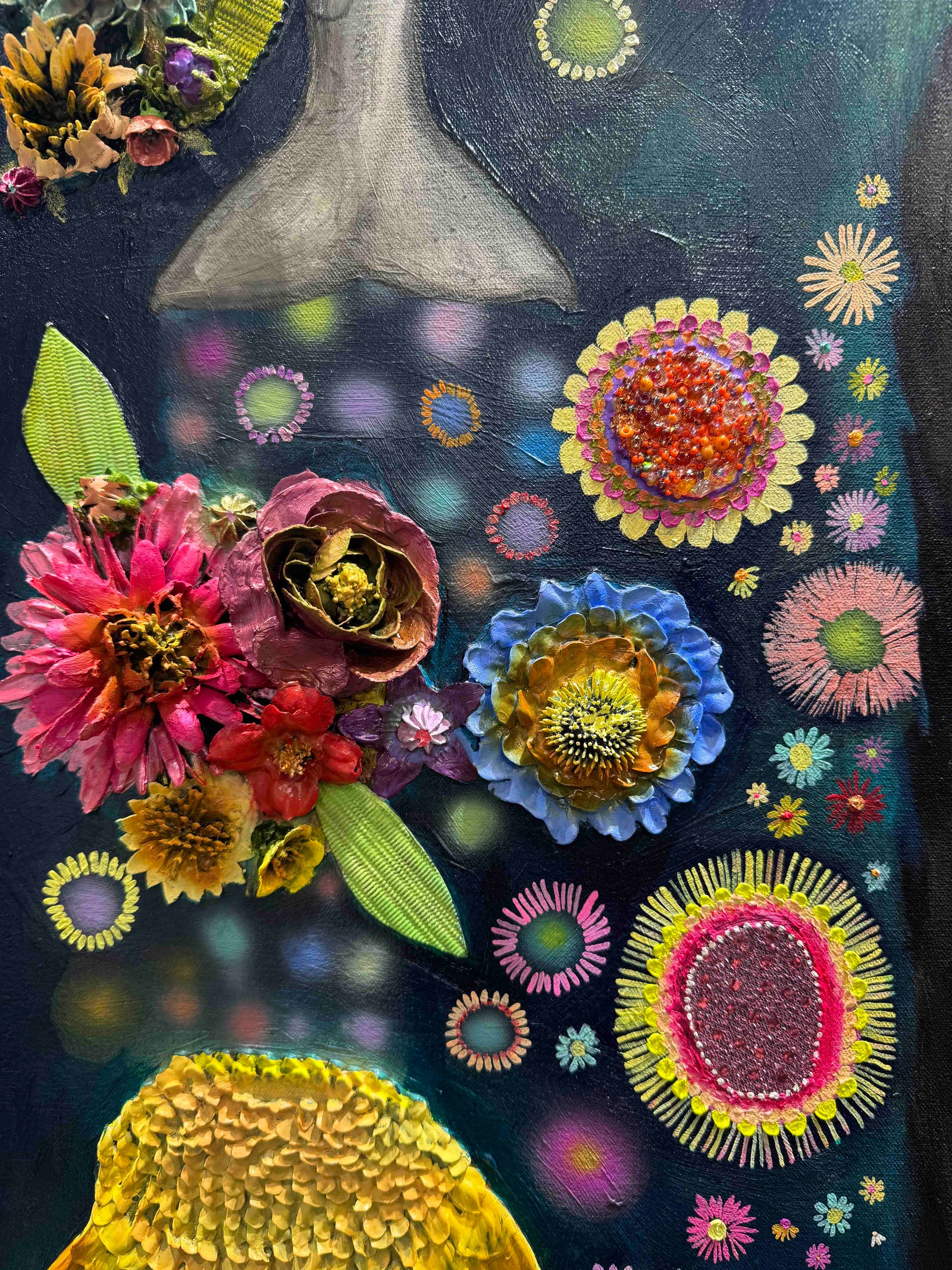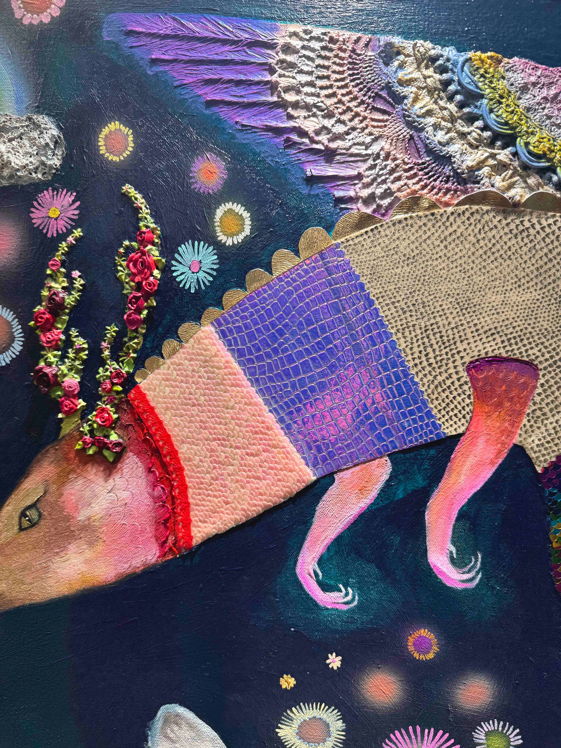 Oil, acrylic, yarn, fabric, paper, and found objects on a handmade canvas.