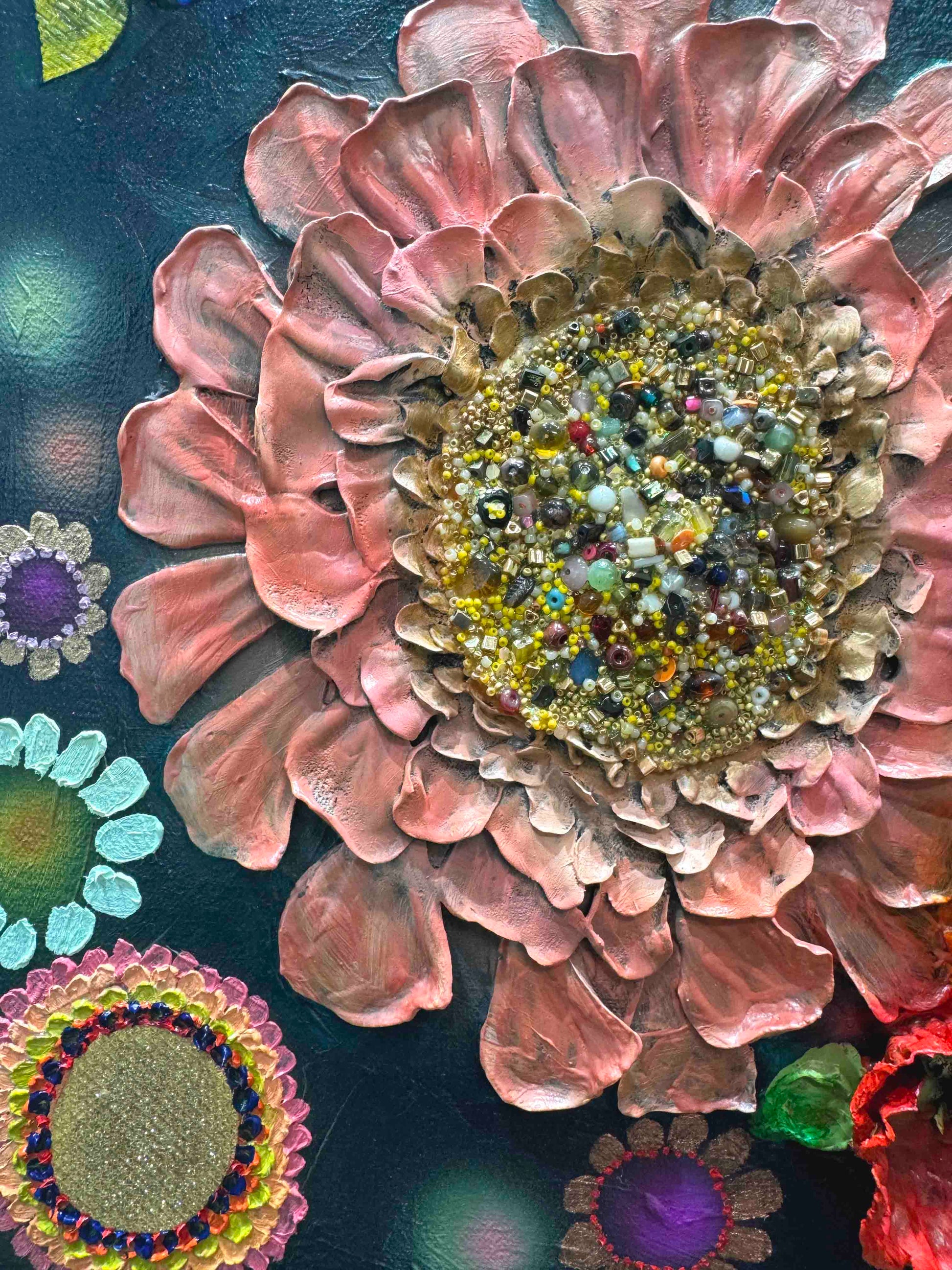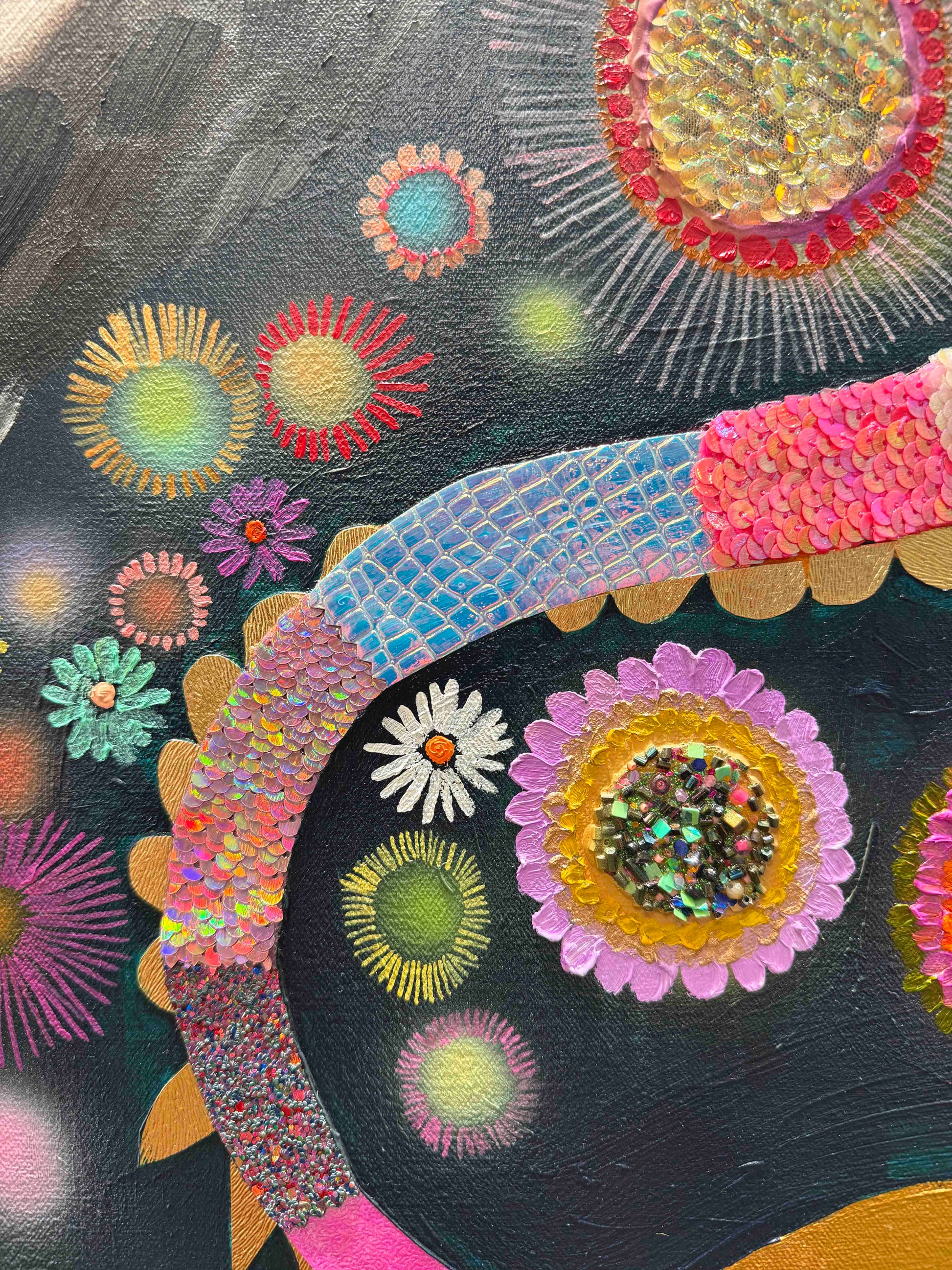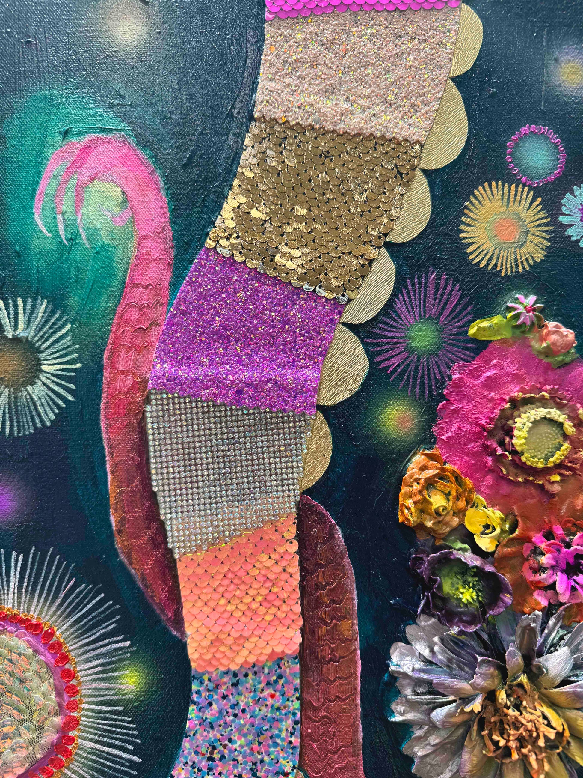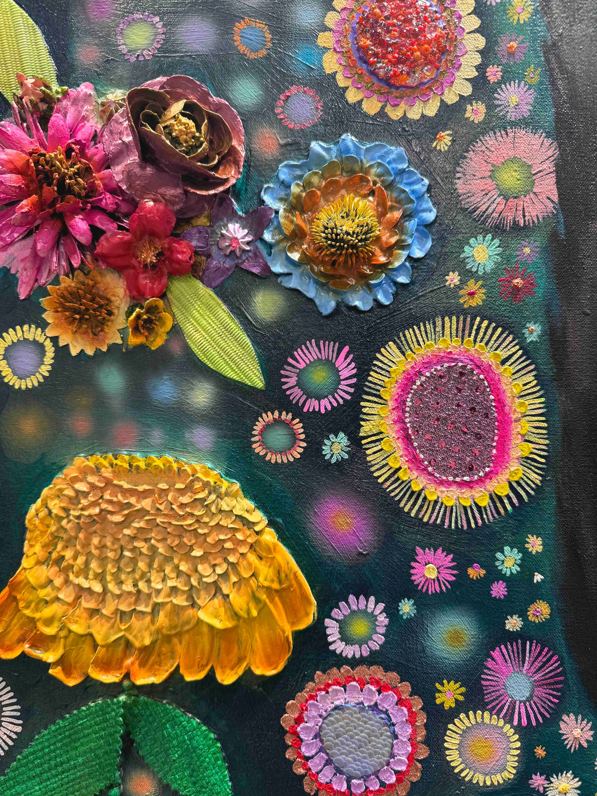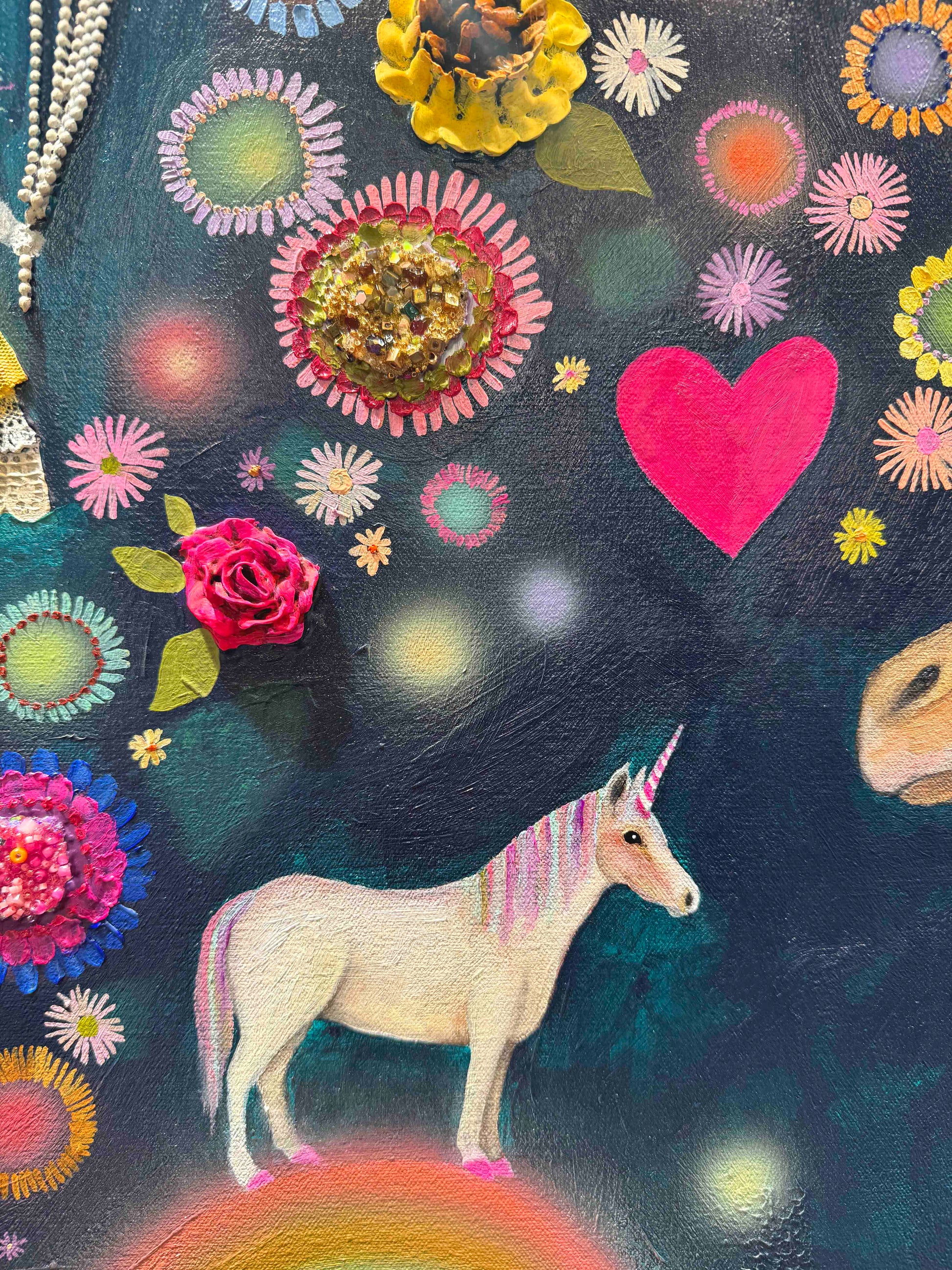 Oil, acrylic, yarn, fabric, paper, and found objects on a handmade canvas.